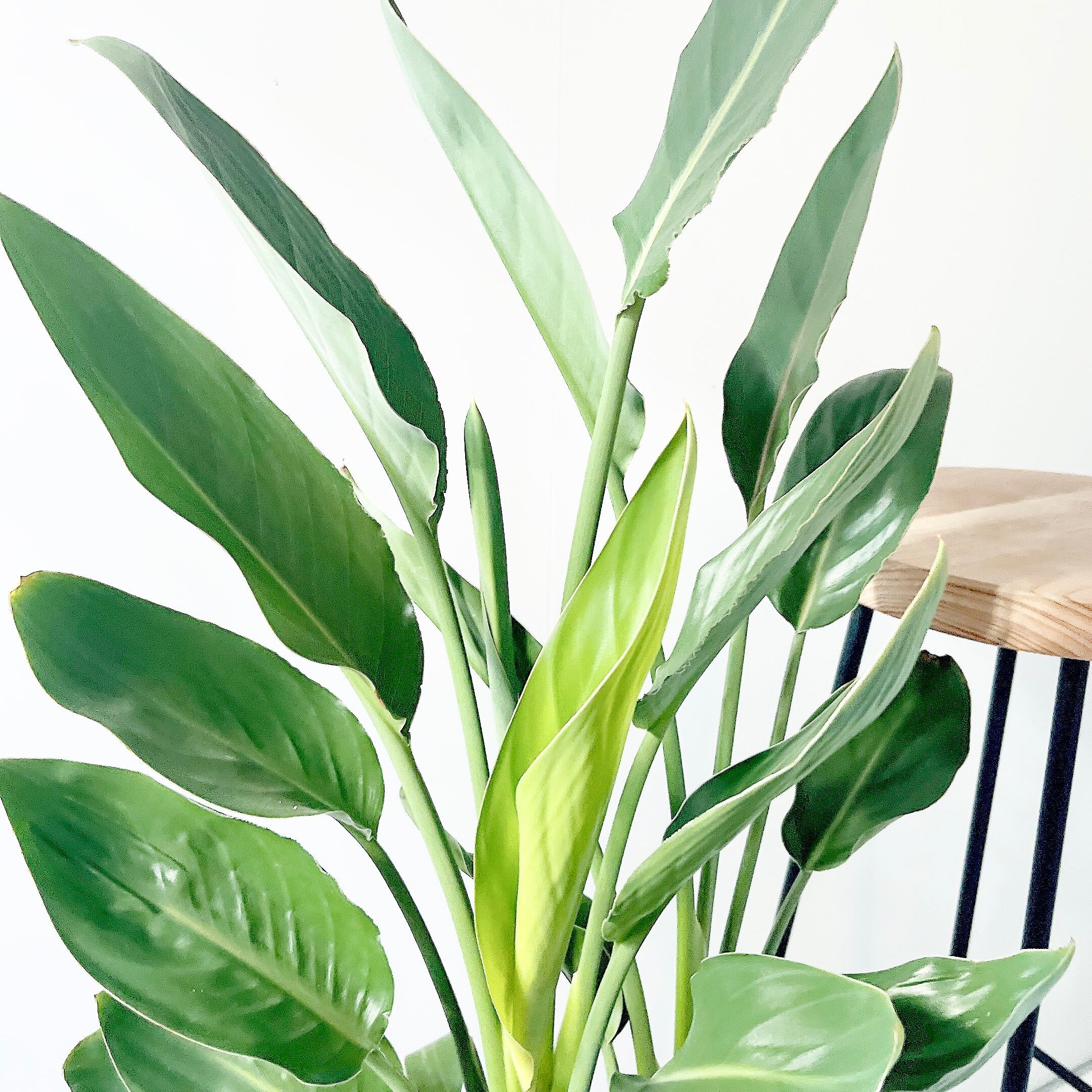 ストレリチア レギネは、オーガスタに比べ葉が細長くやや小ぶりで、濃い緑色をした上品な葉姿が特徴です。