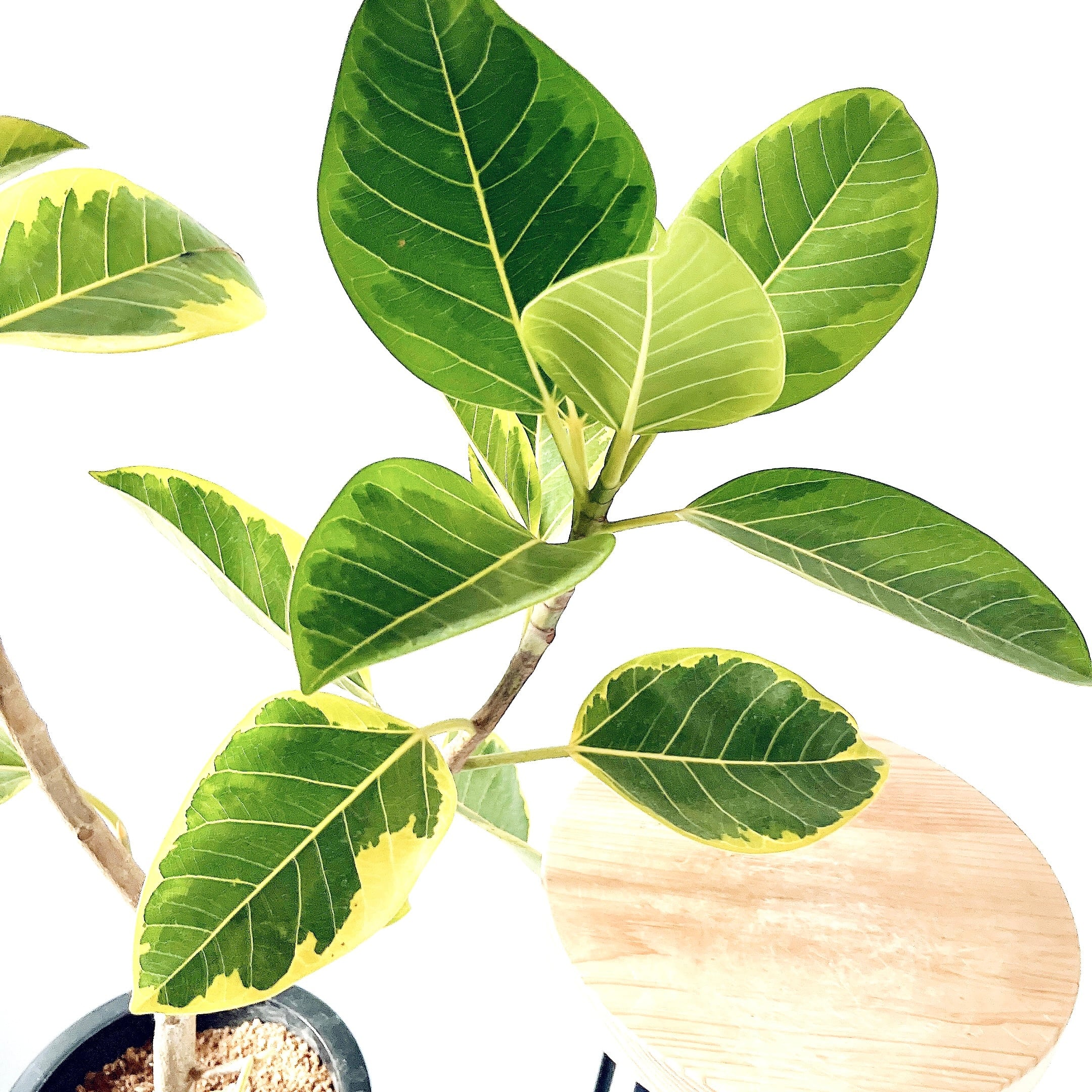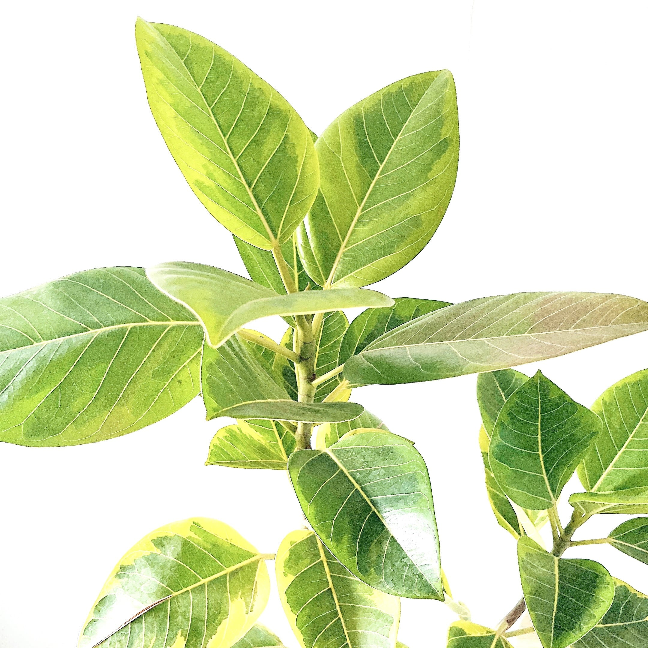 明るいライムグリーンの斑が美しいフィカス・アルテシマ。