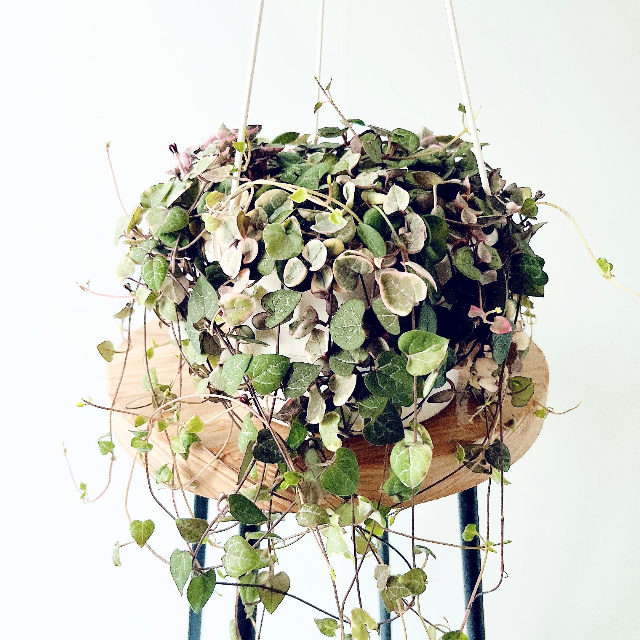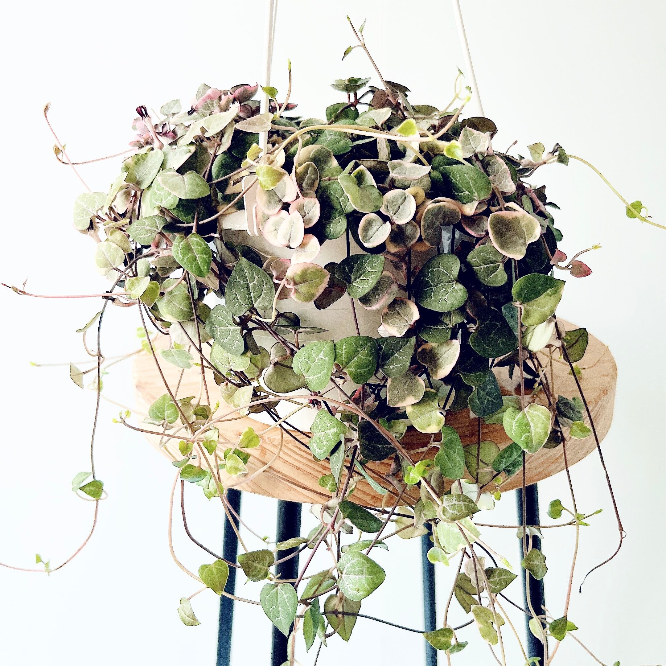 ハートカズラは、ハート形の愛らしい葉をたくさんつける多肉植物です。小ぶりでありながらも、垂れ下がる姿が優雅で、インテリアに自然な彩りを添えます。美しい白〜ピンクの斑が入ります。
