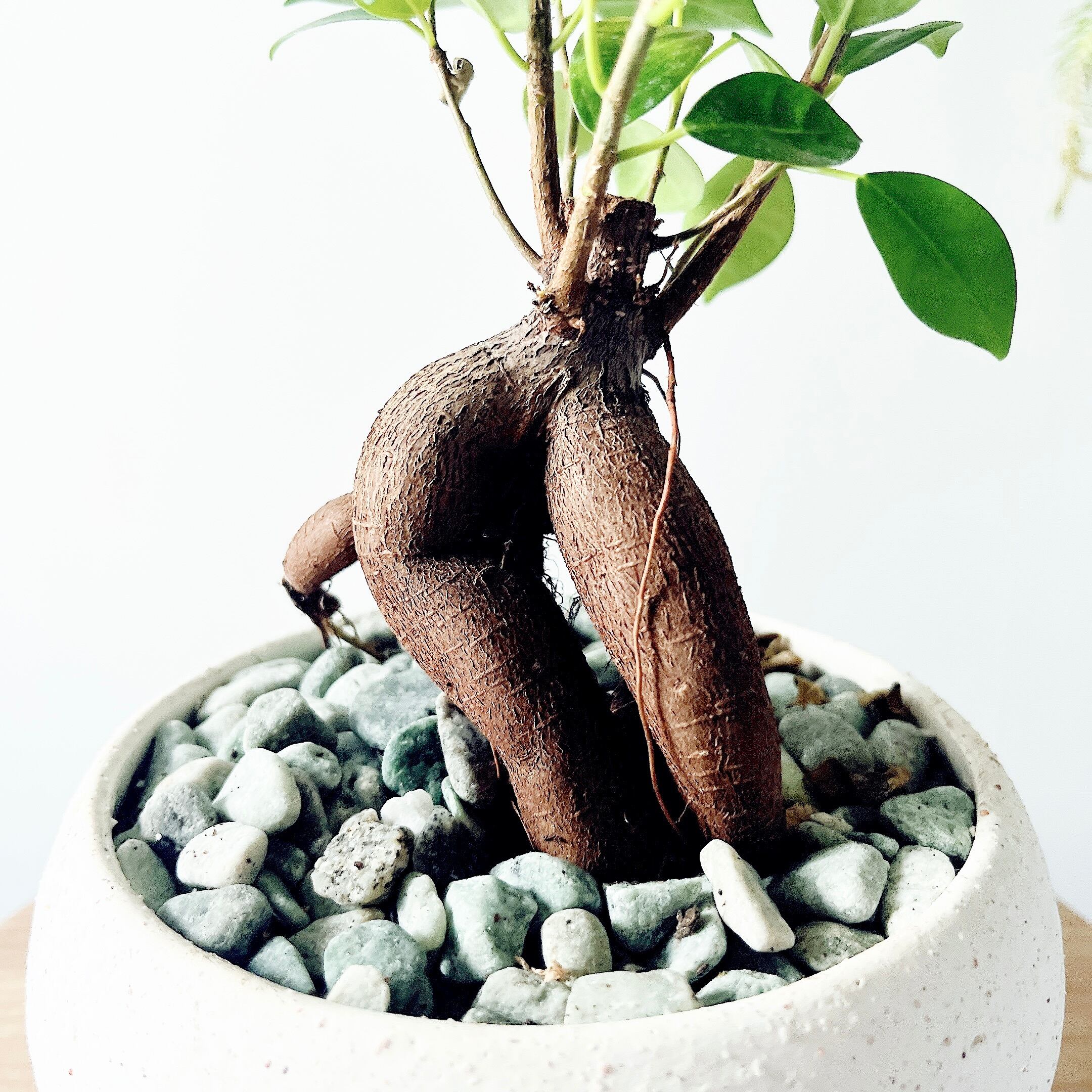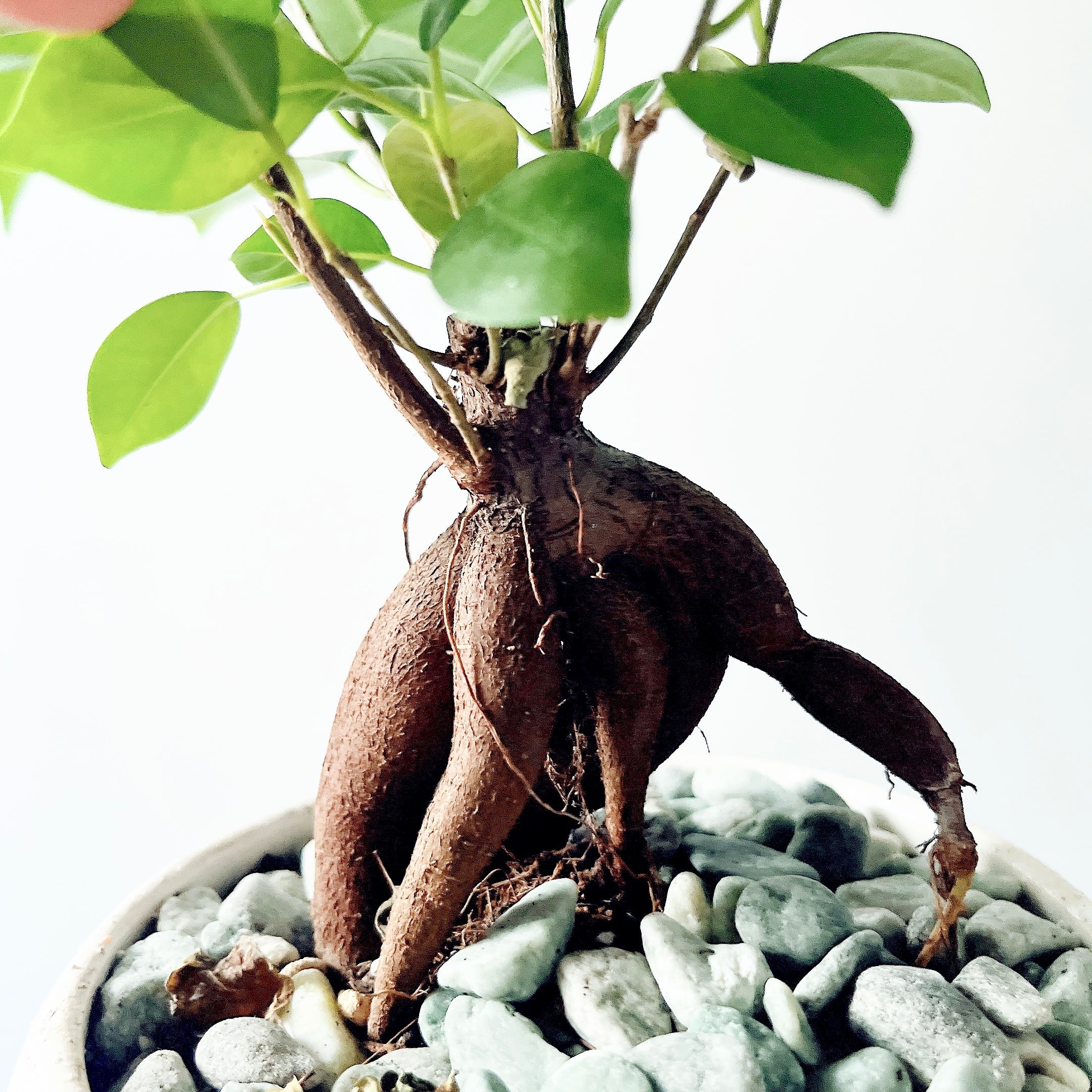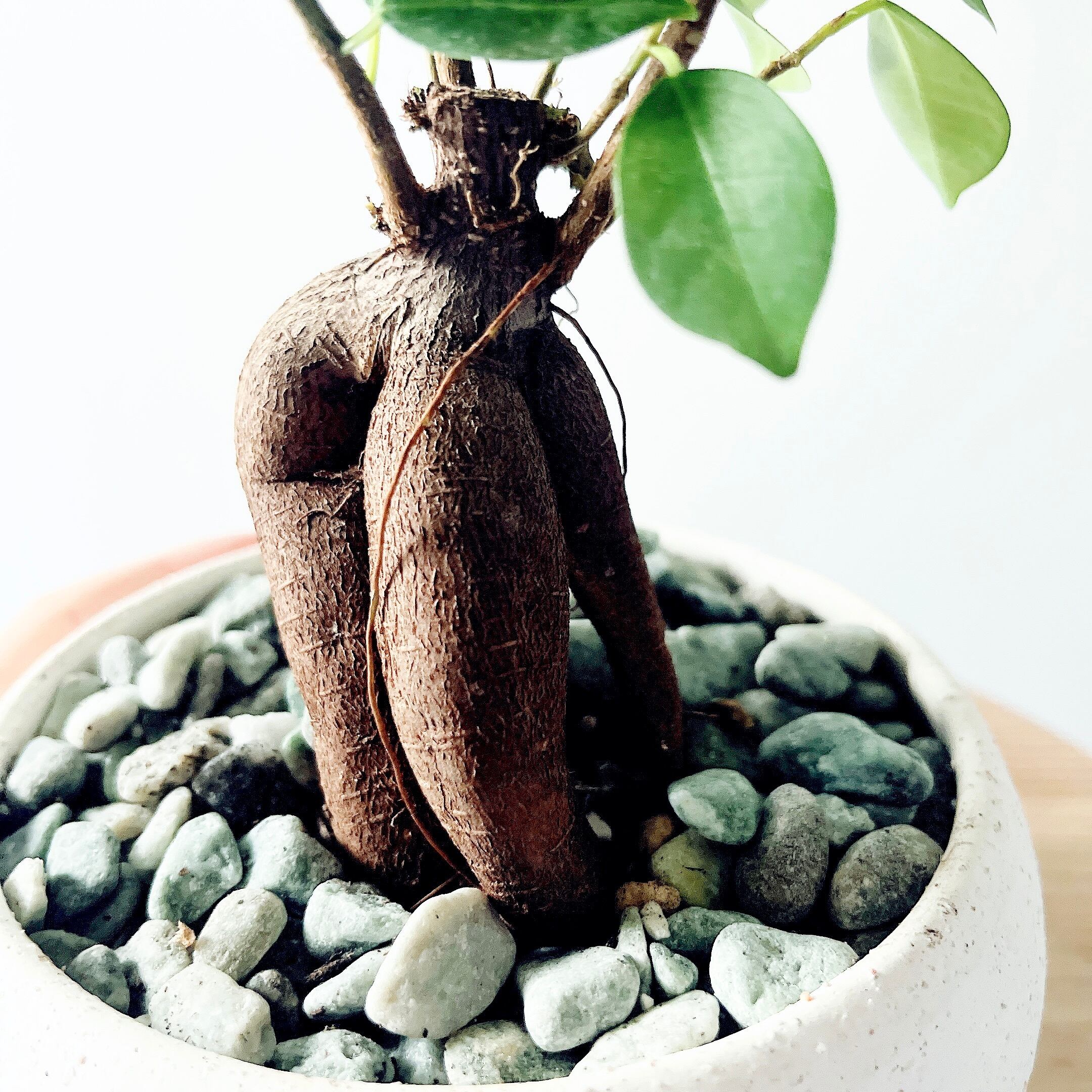 種から育てて幹が太くなったものをニンジンガジュマルと呼んでいます。小さくて可愛らしい艶やかな丸葉が人気です。