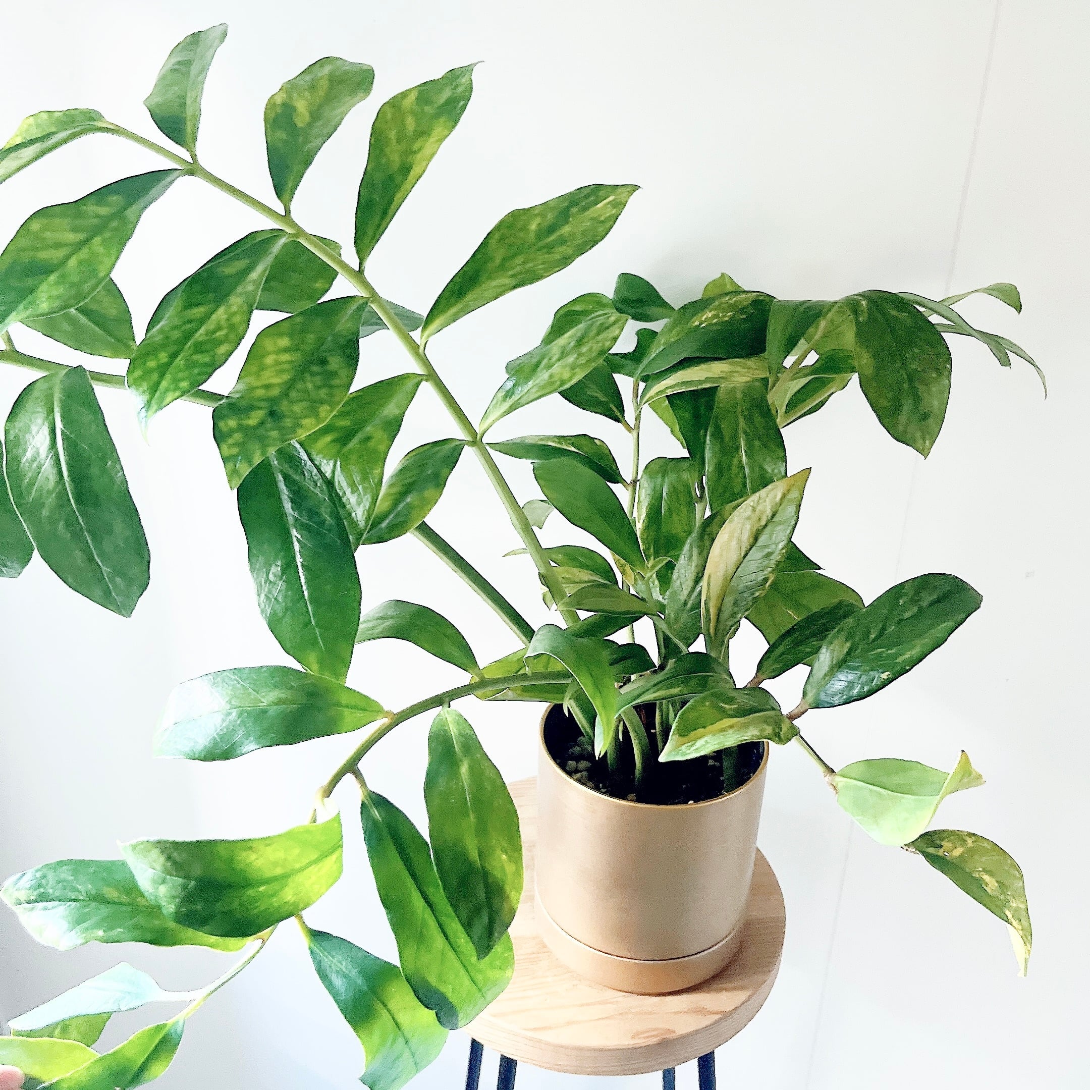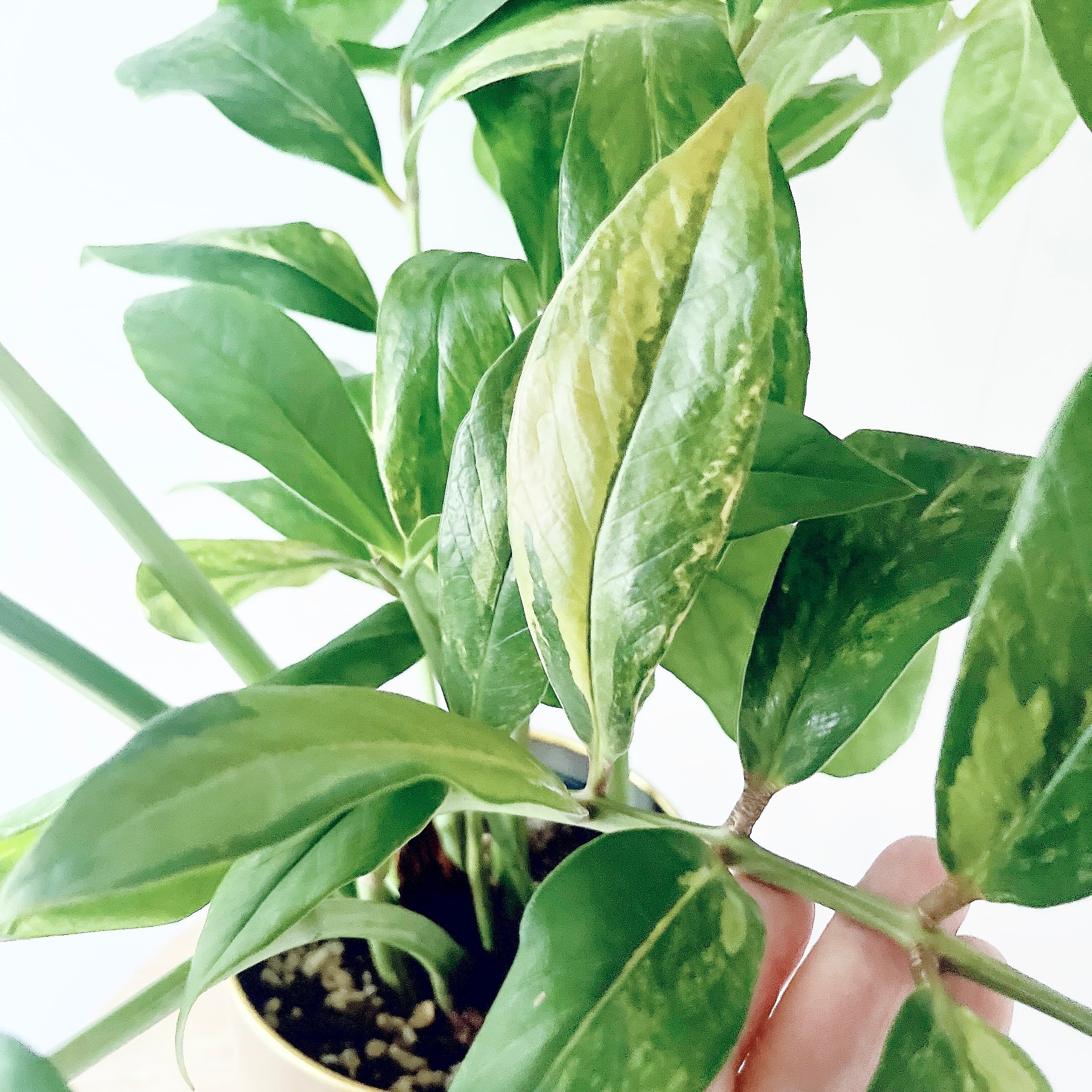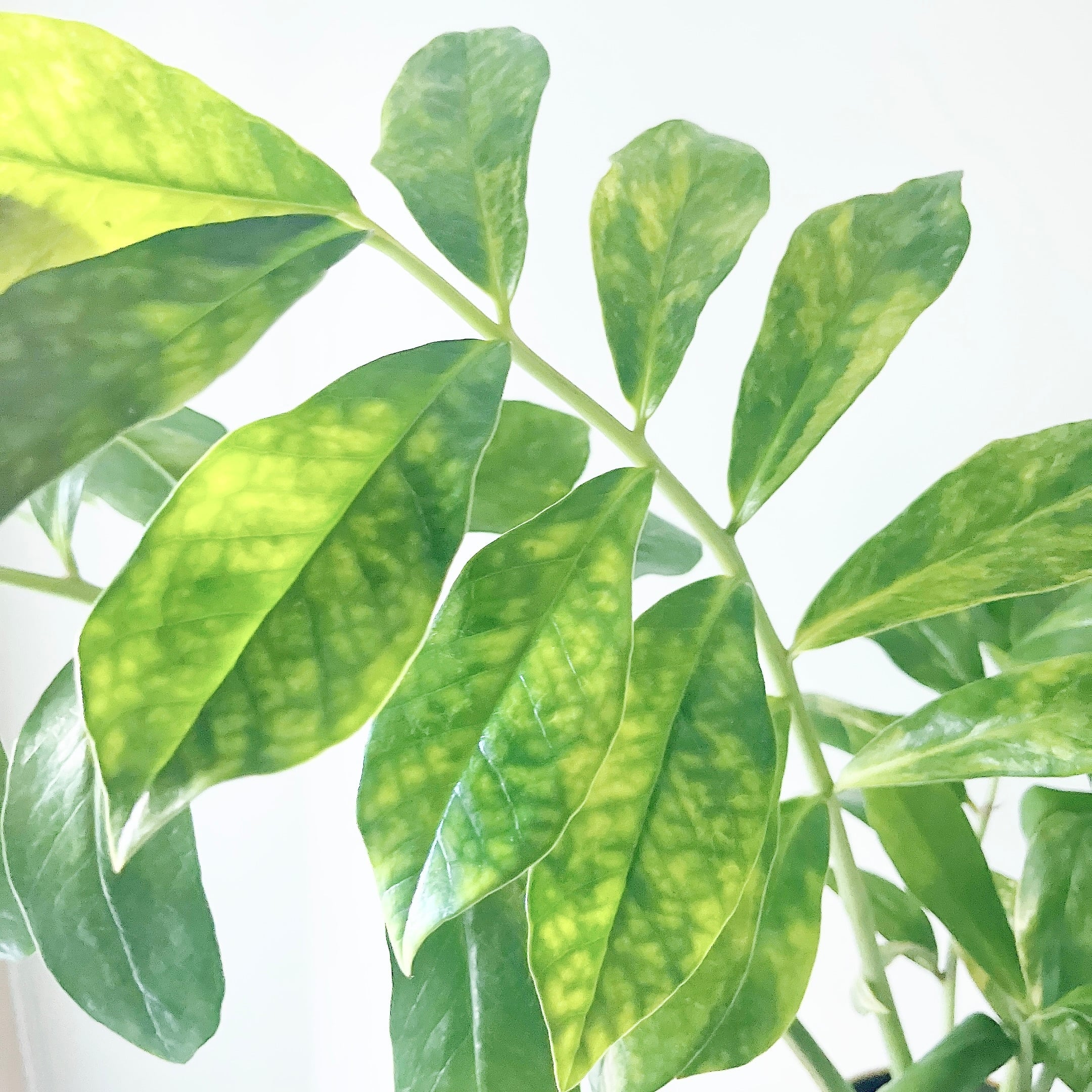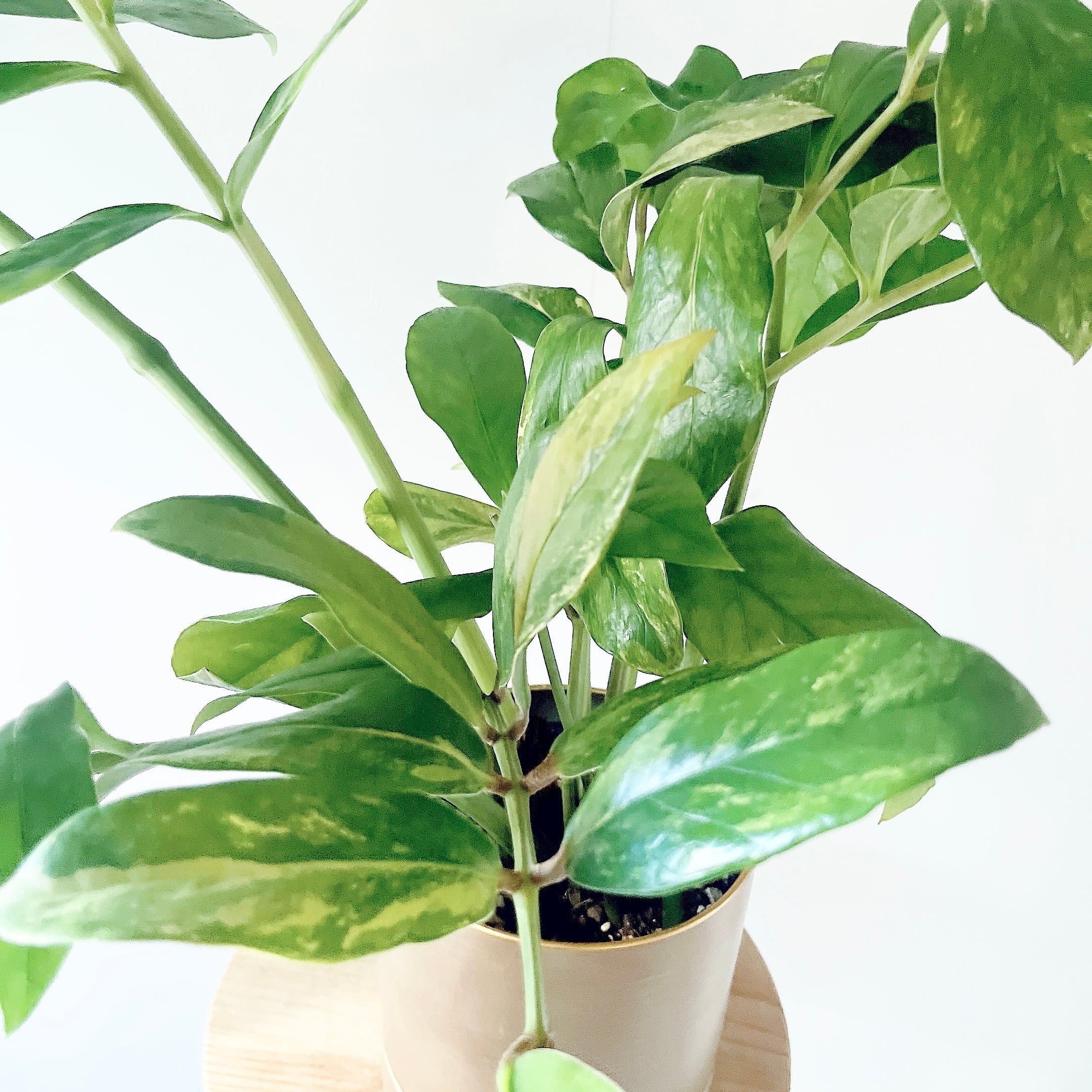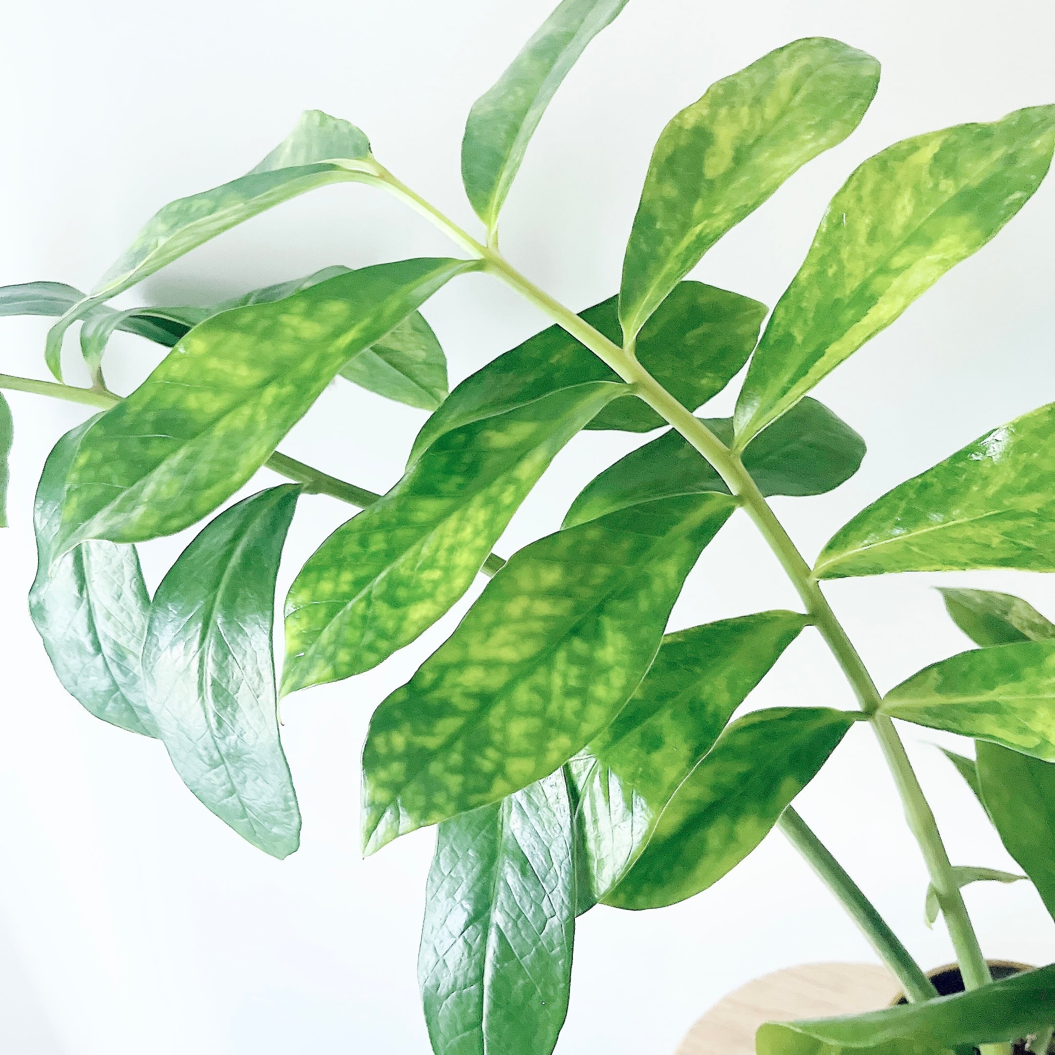 深いグリーンに、やわらかなライムカラーの斑が溶け込む希少な斑入りザミオクルカス。