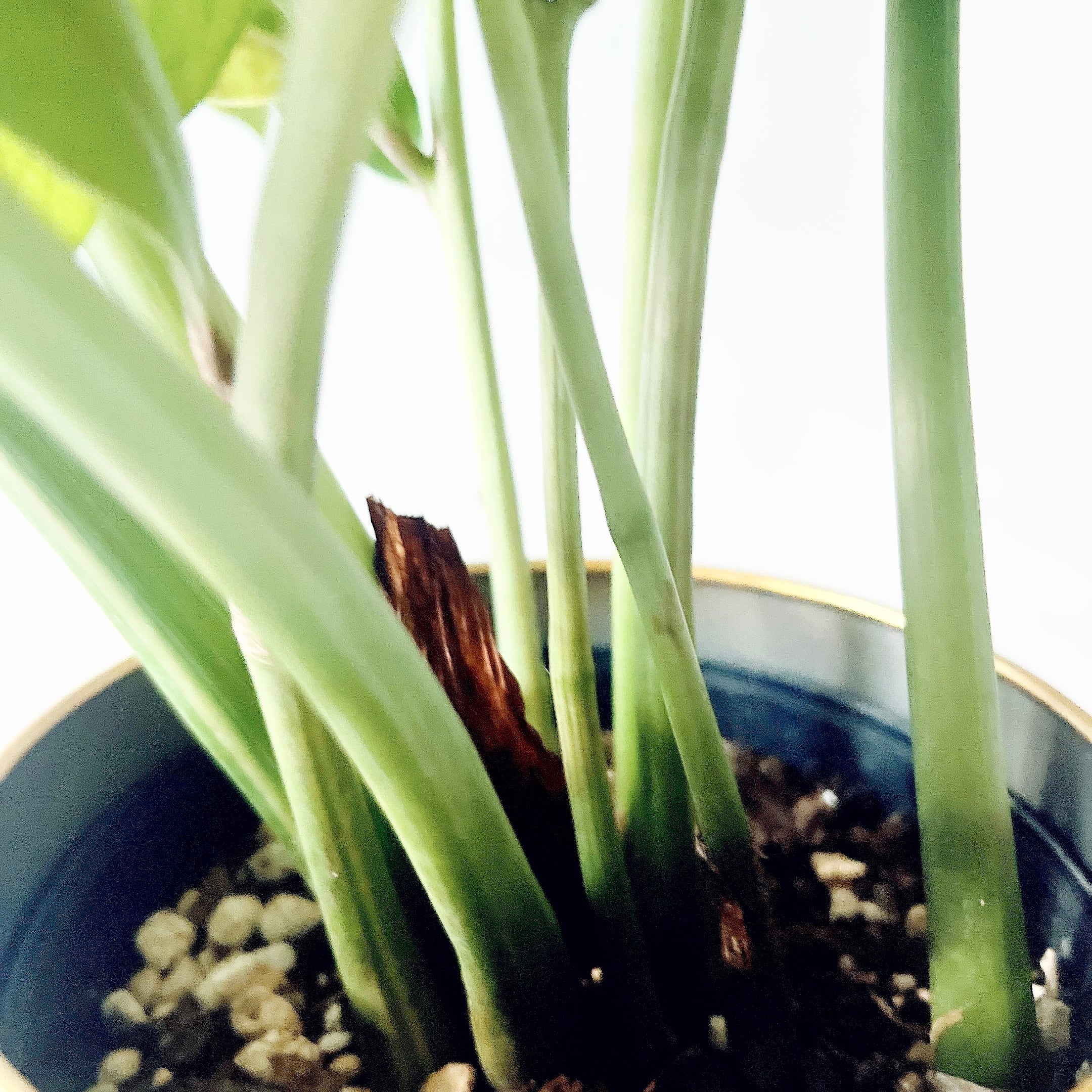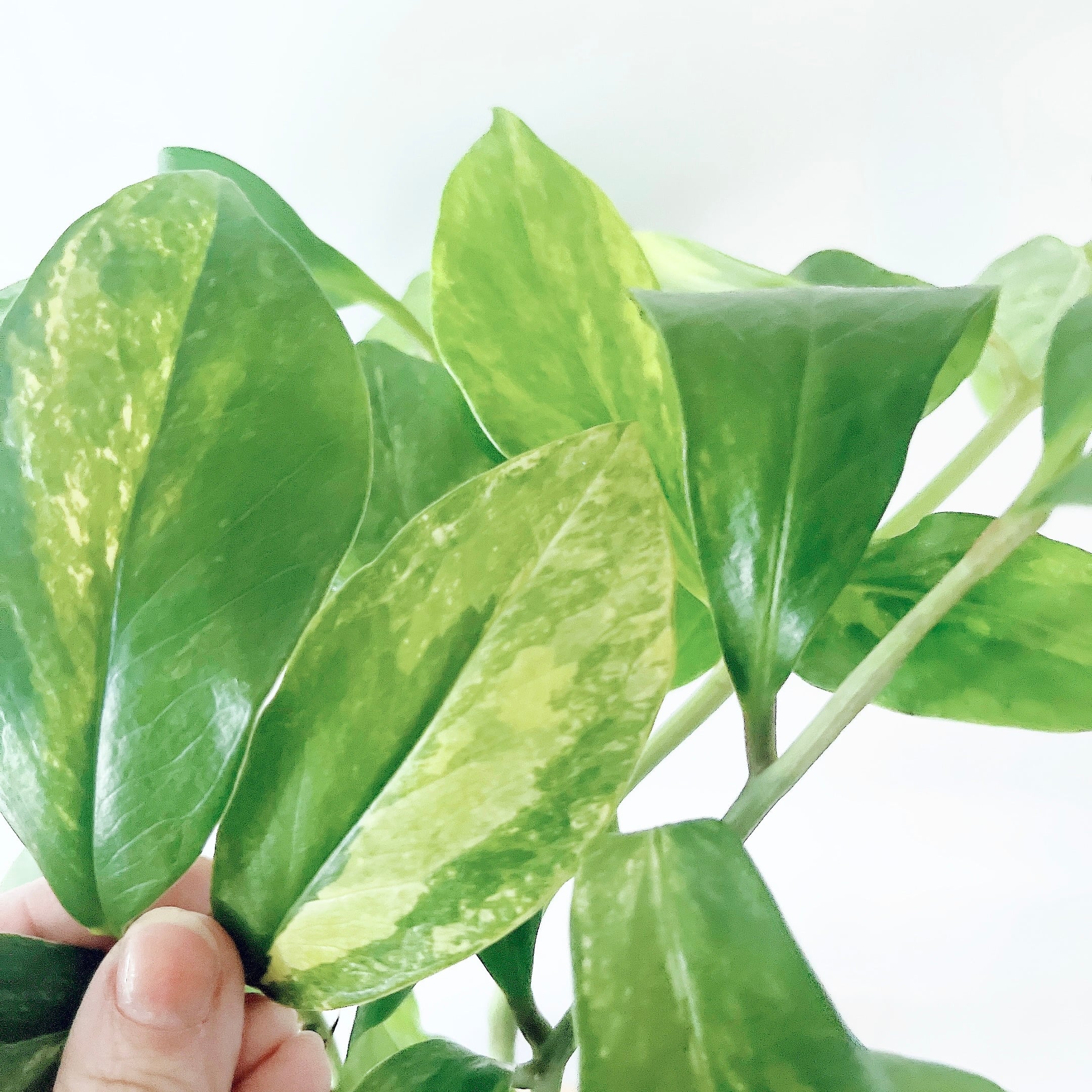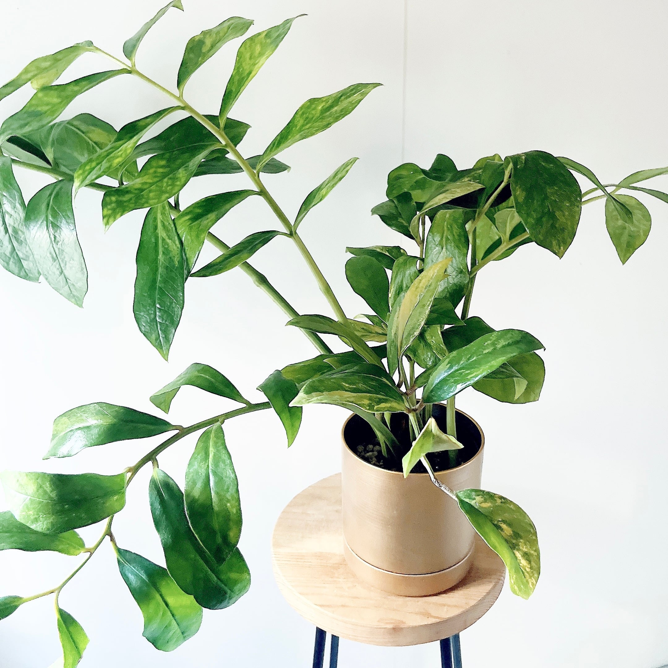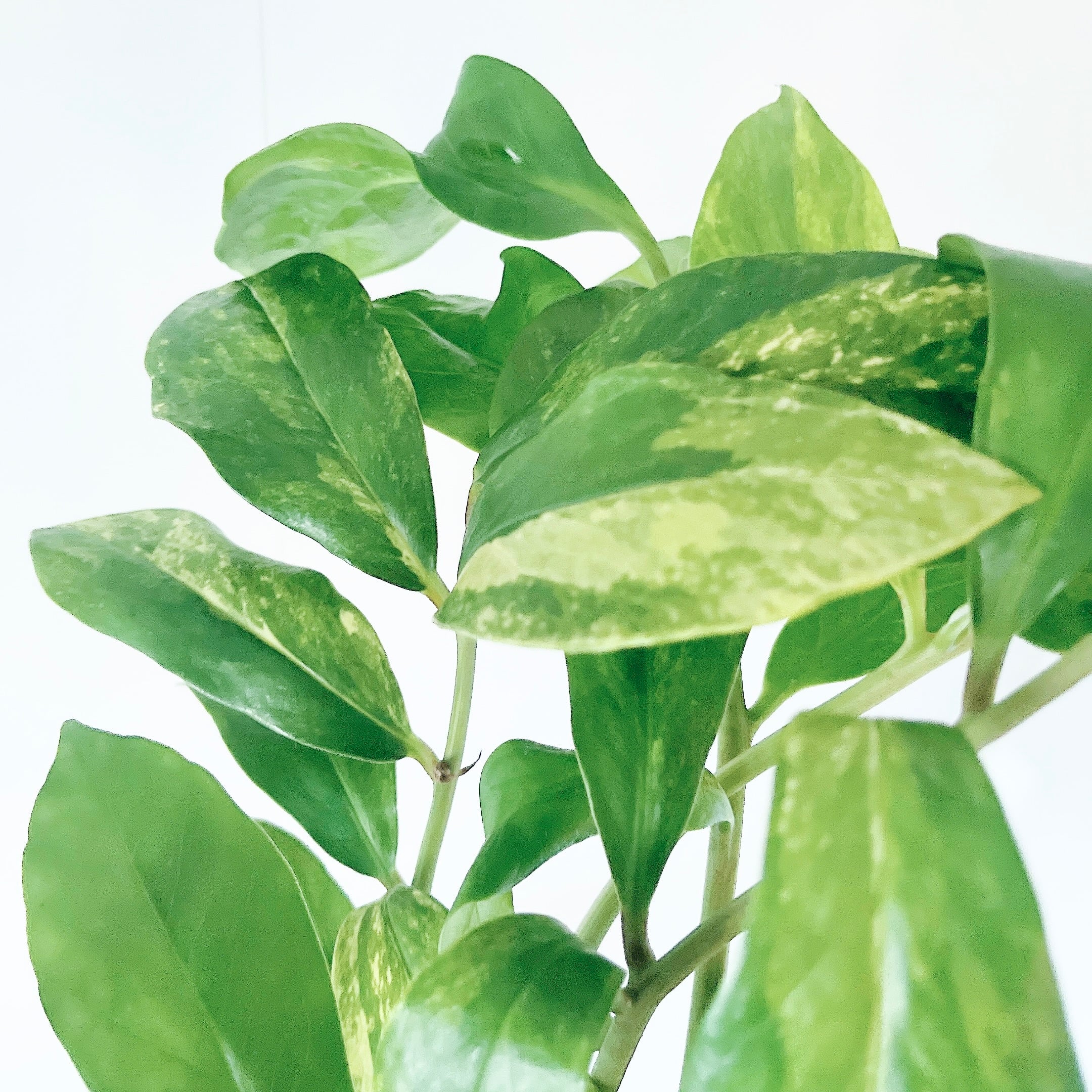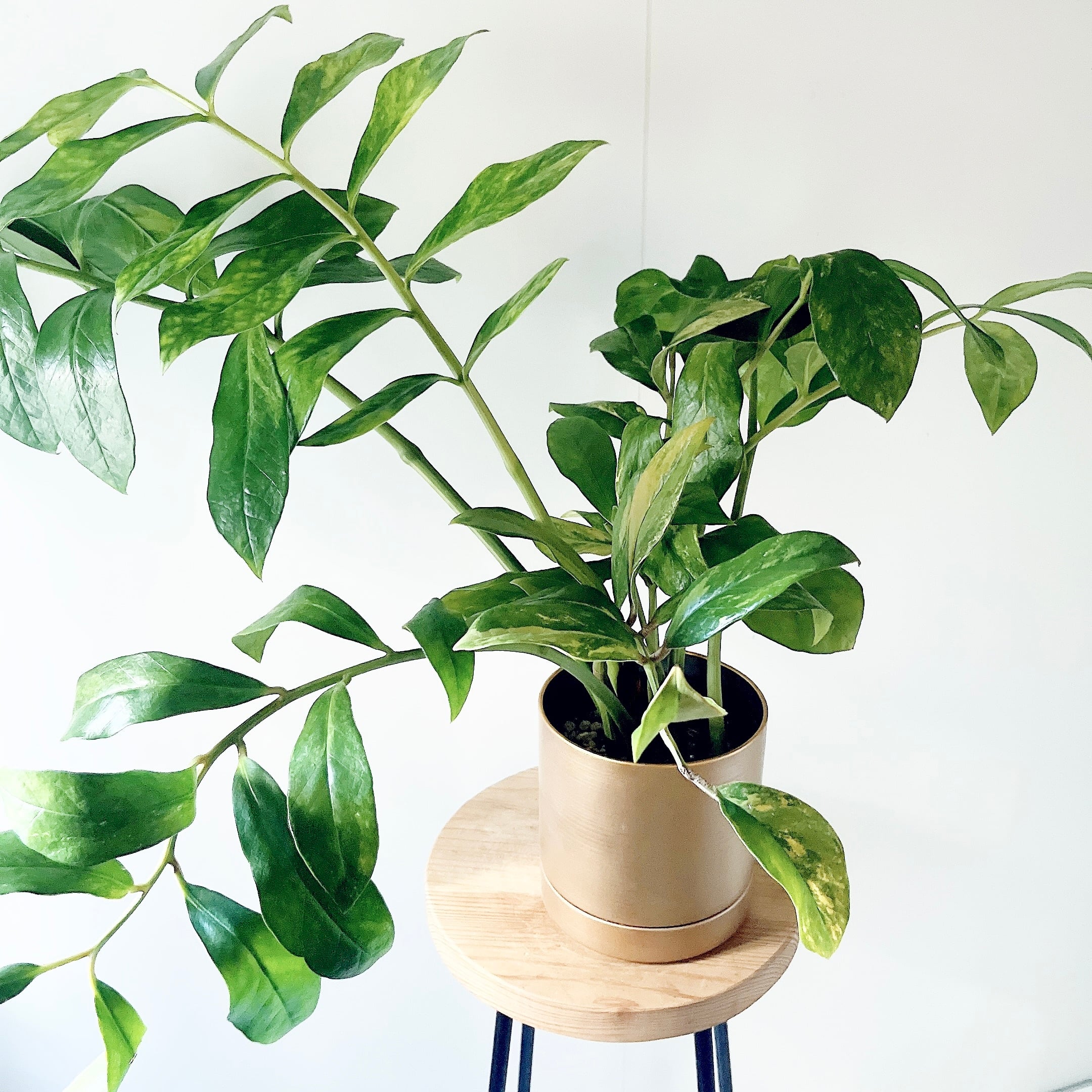 深いグリーンに、やわらかなライムカラーの斑が溶け込む希少な斑入りザミオクルカス。