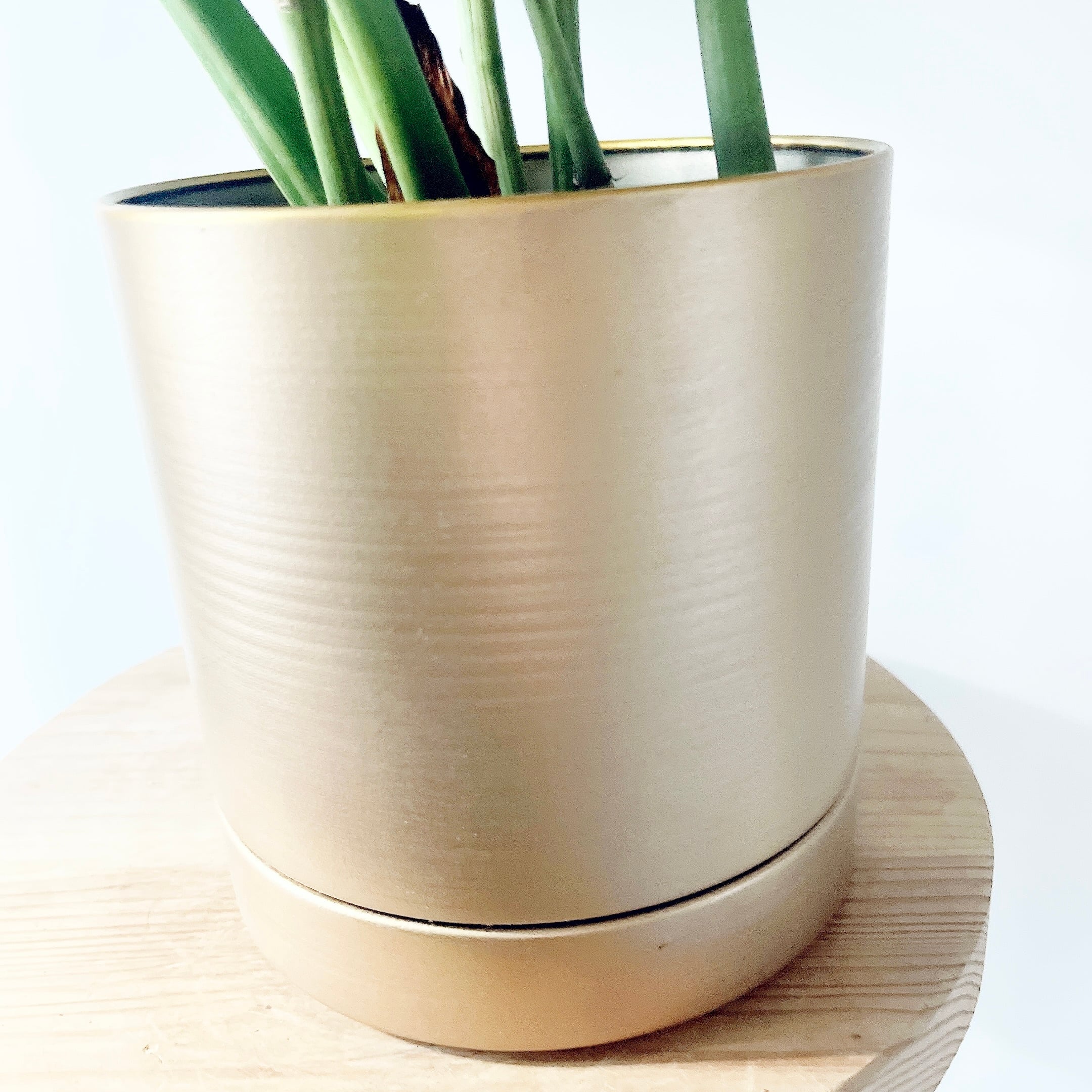 植物の美しさをより一層引き立てる、アンティークゴールドの鉢カバー(受け皿付き)です。