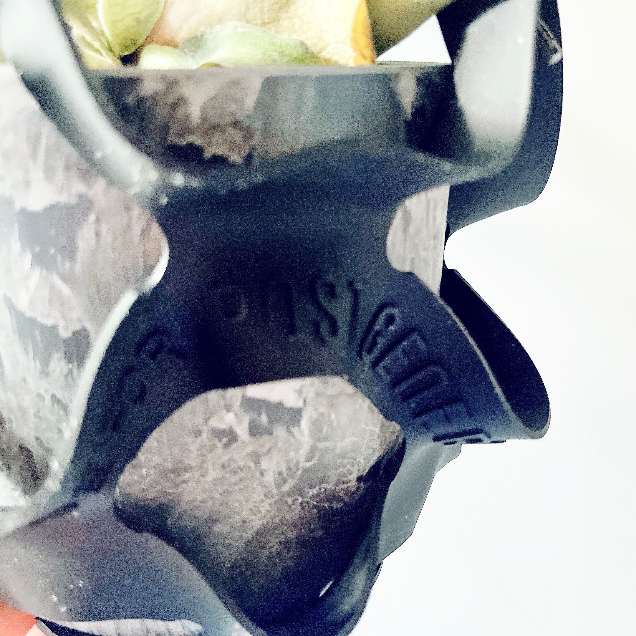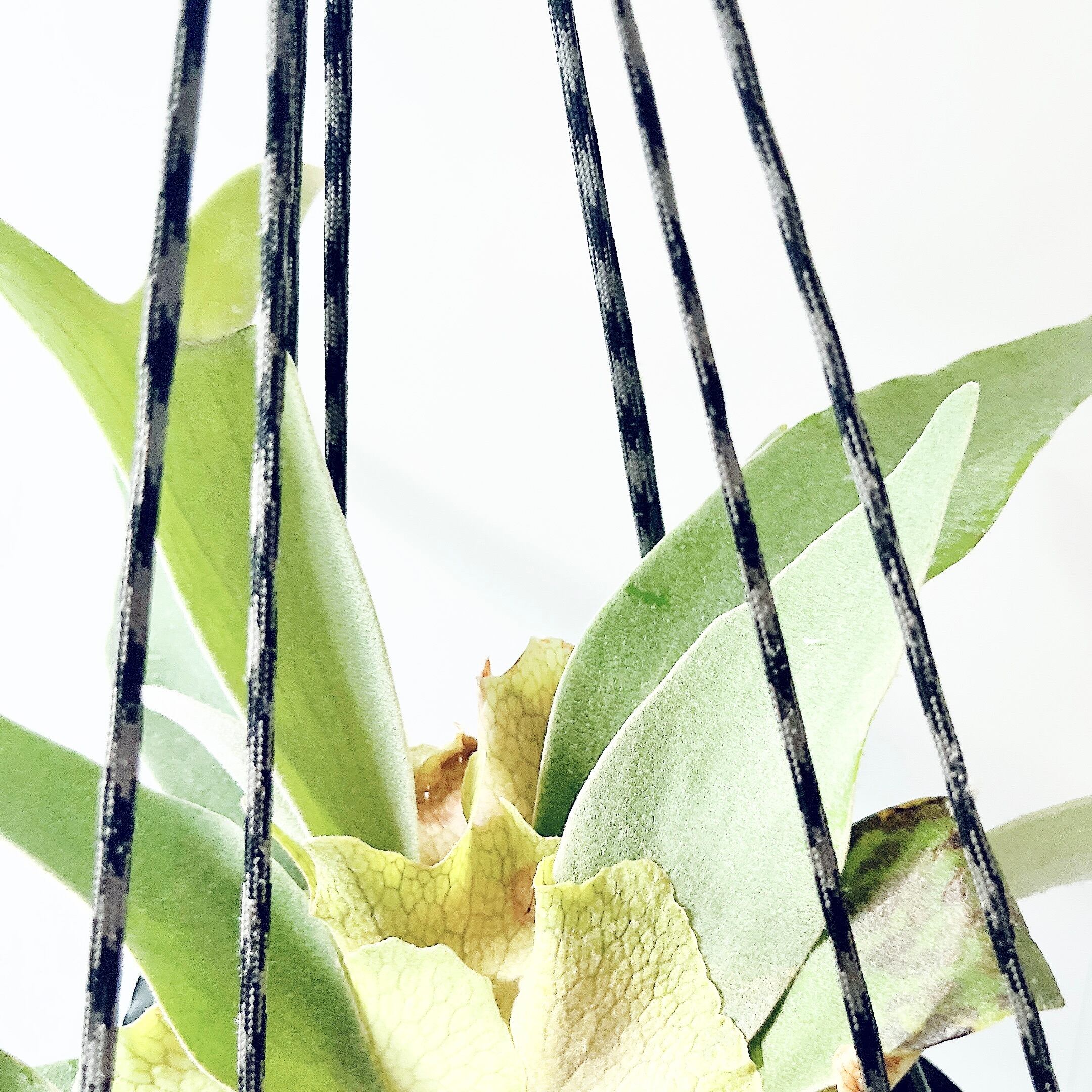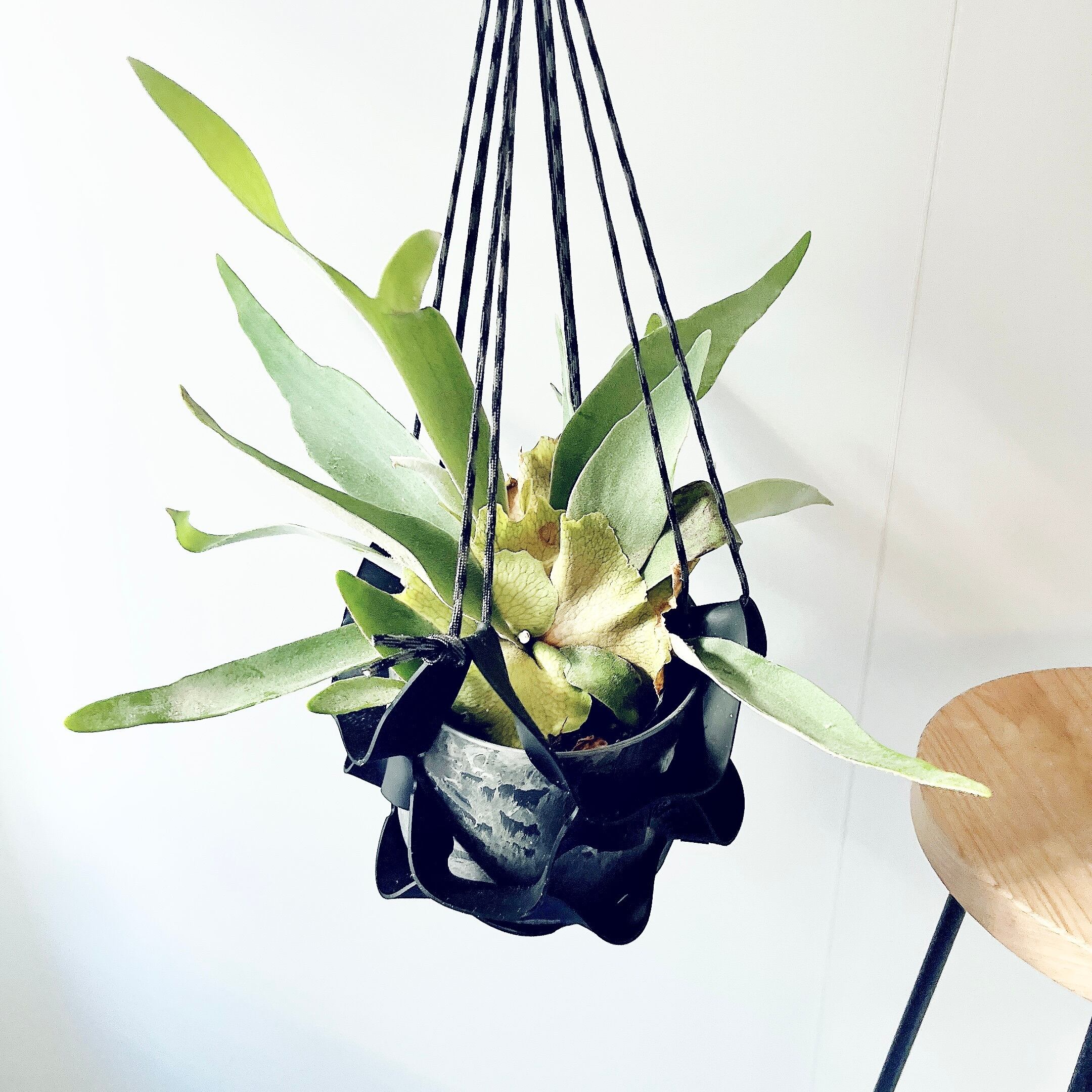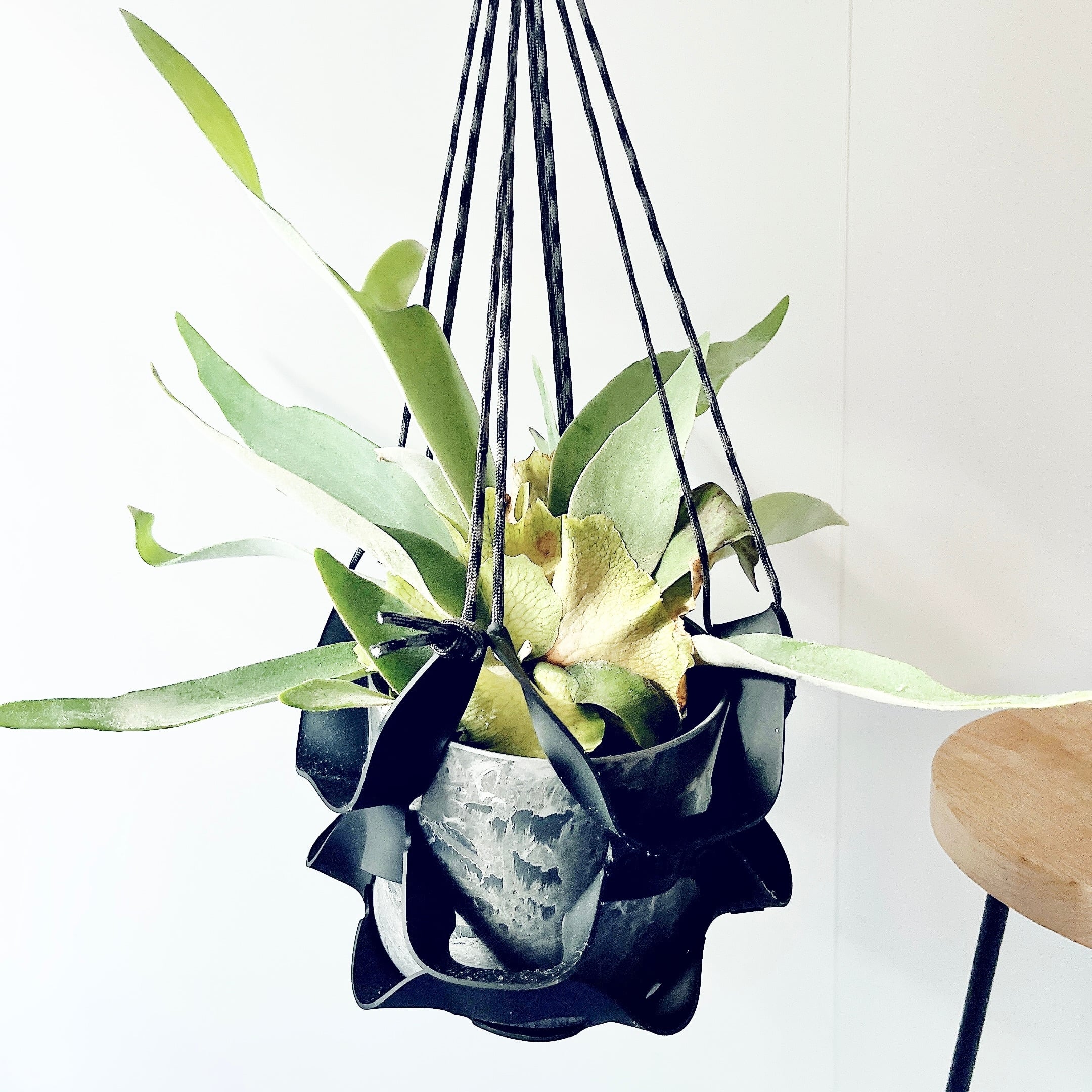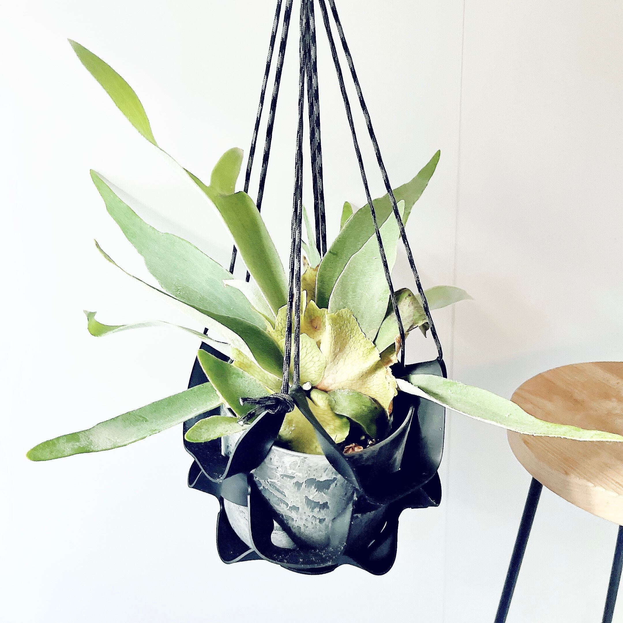 コウモリラン(ヴィーチー)を、ブラックのハンギングラバーに仕立てたcalm cafeセレクトのハンギンググリーン。