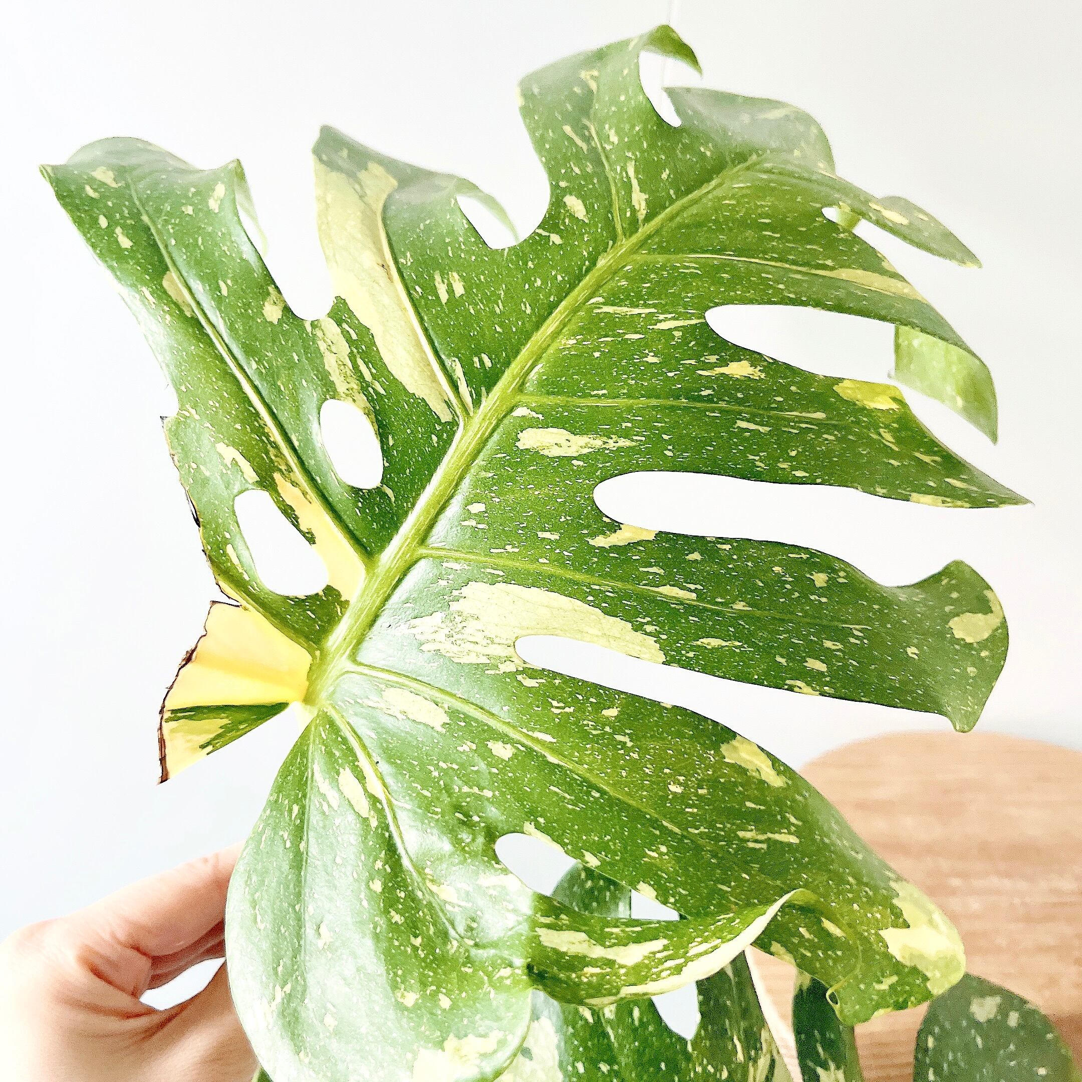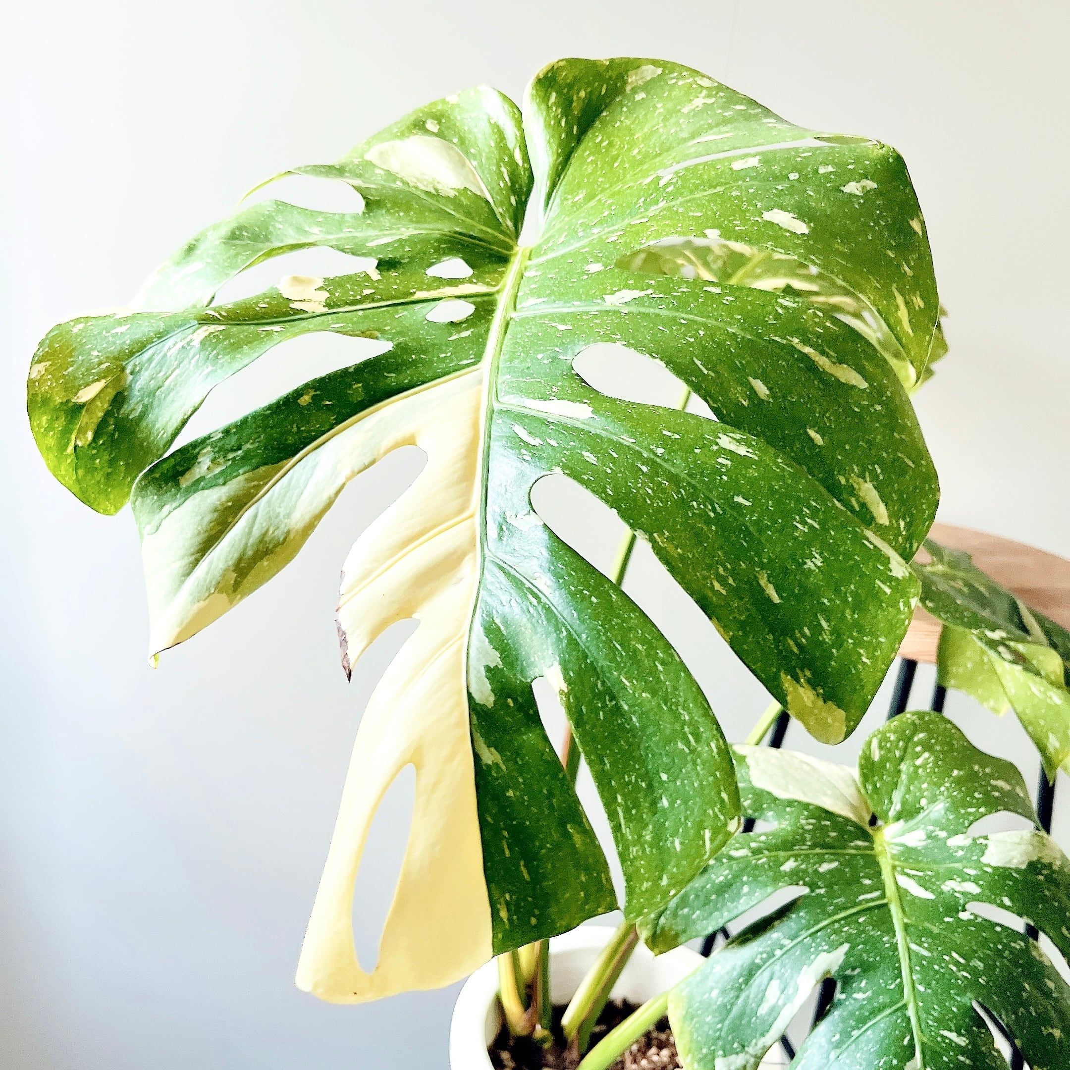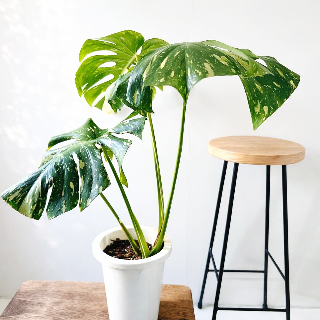 モンステラ タイコンステレーションは、星空のように散りばめられたクリーム色の斑が美しく、1枚1枚異なる表情を楽しめる魅力的な品種です。