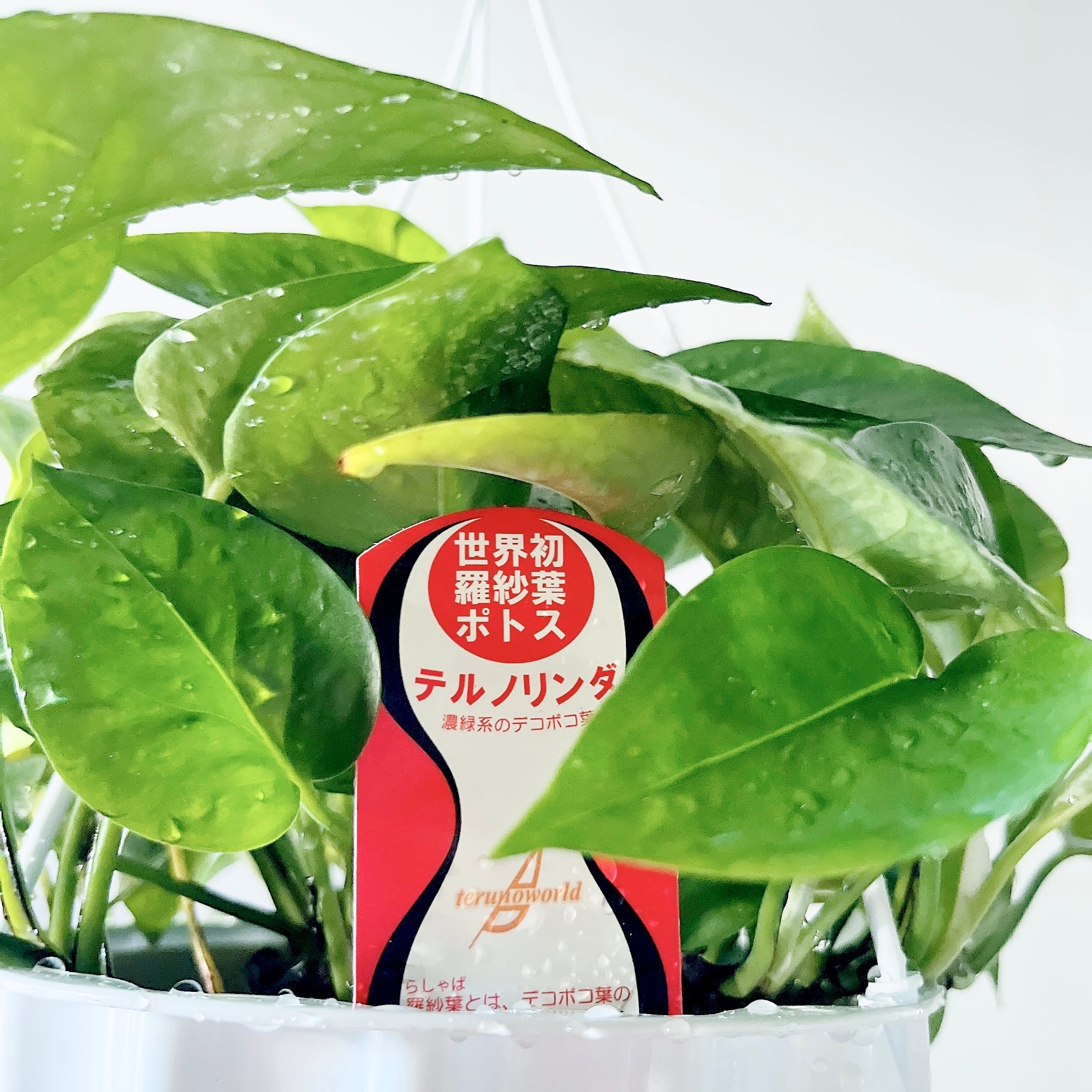テルノリンダは、テルノバンピーの枝変わりで濃緑色で光沢がある、世界初の羅紗葉(表面がデコボコ)のポトスです。
