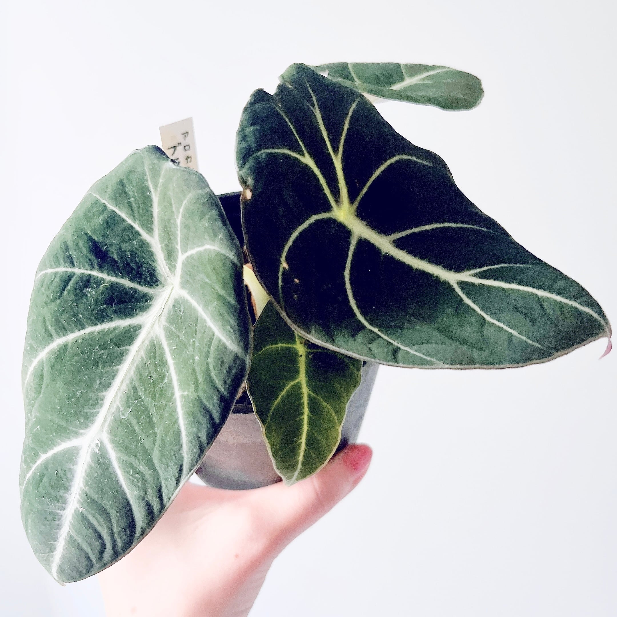 深みのあるダークグリーンの葉と、白く浮かび上がる葉脈が美しいアロカシア・ブラックベルベット。