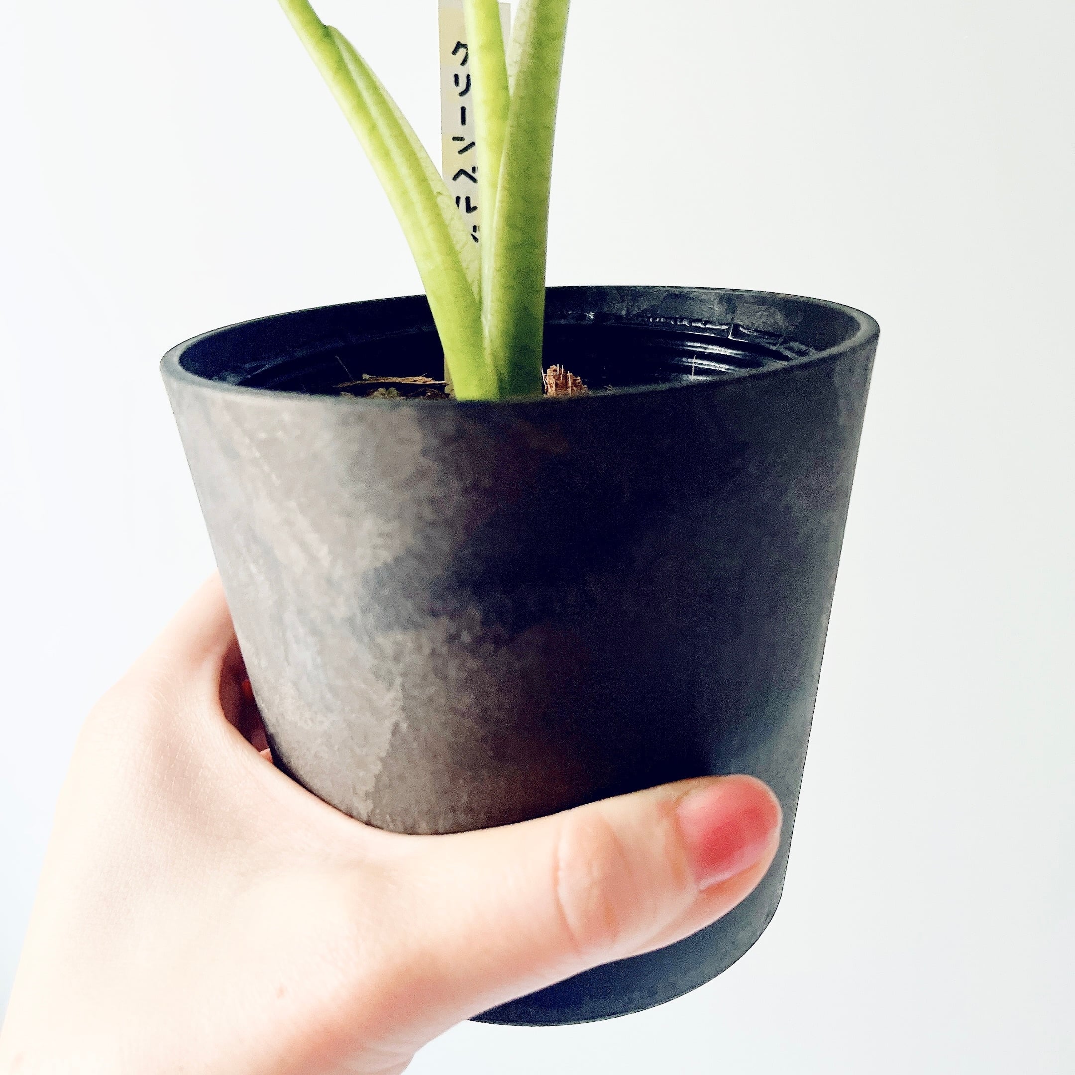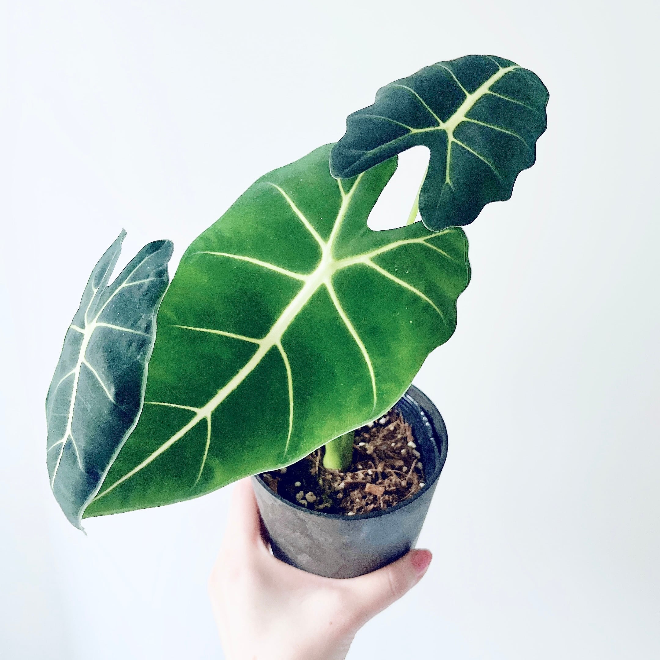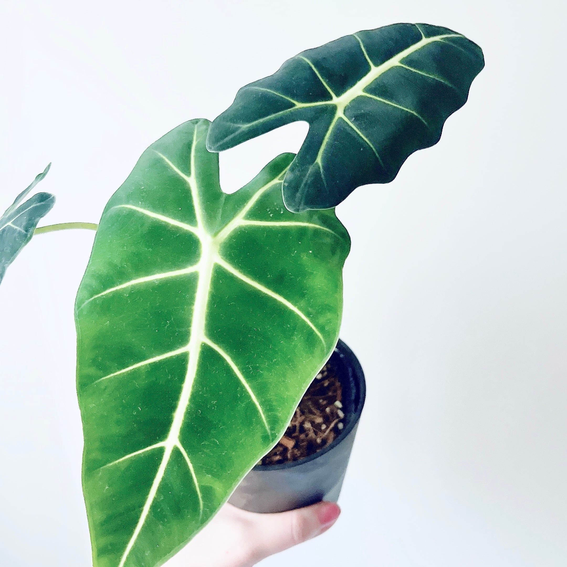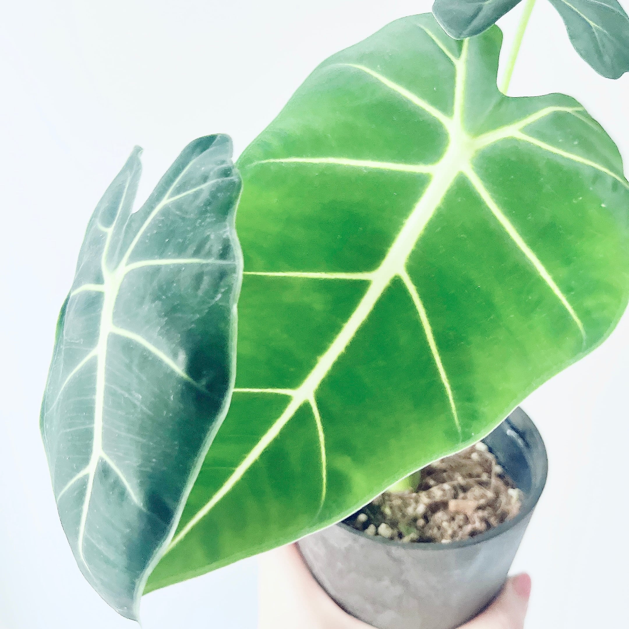 深みのあるグリーンの葉と、はっきりと浮かぶ葉脈が美しいアロカシア・グリーンベルベット。落ち着いた色合いとベルベット調の質感が特徴で、上品な存在感を楽しめる一鉢です。