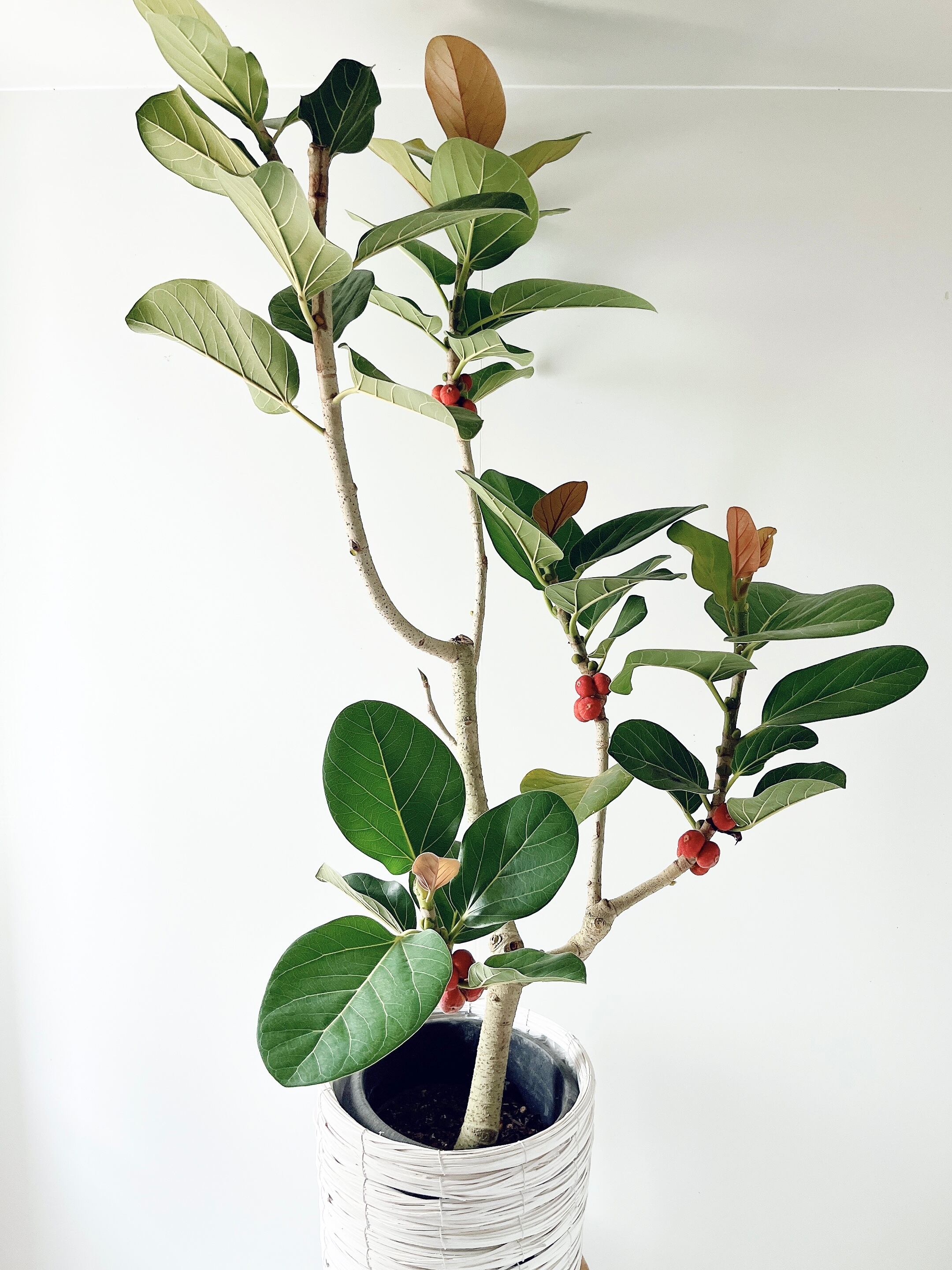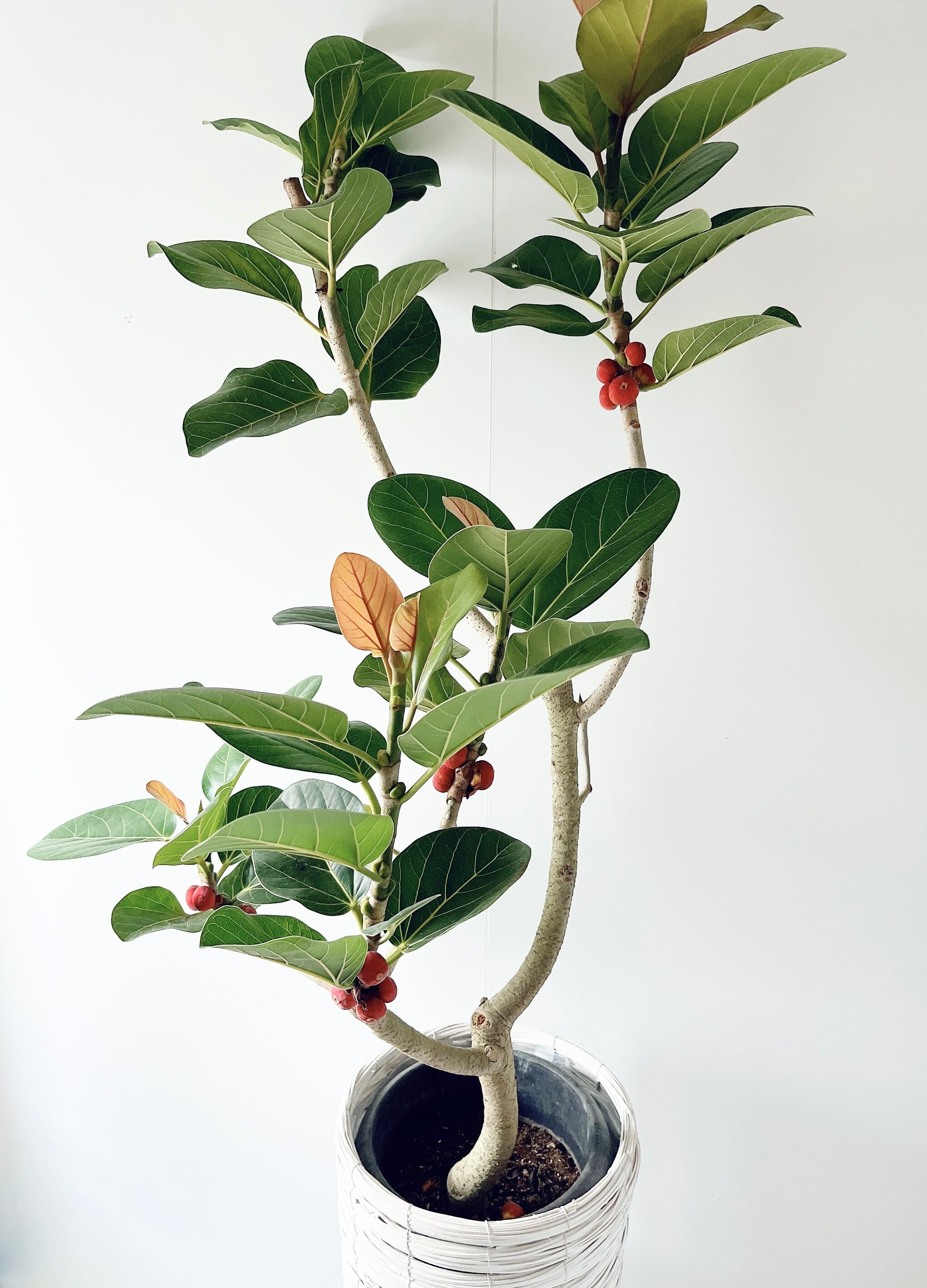 フィカス ルーカスは、ベンガレンシスに似たゴムの木で、肉厚な楕円の葉に白い葉脈が美しい観葉植物です。ベンガレンシスに比べ、より丸い葉の形をしています。