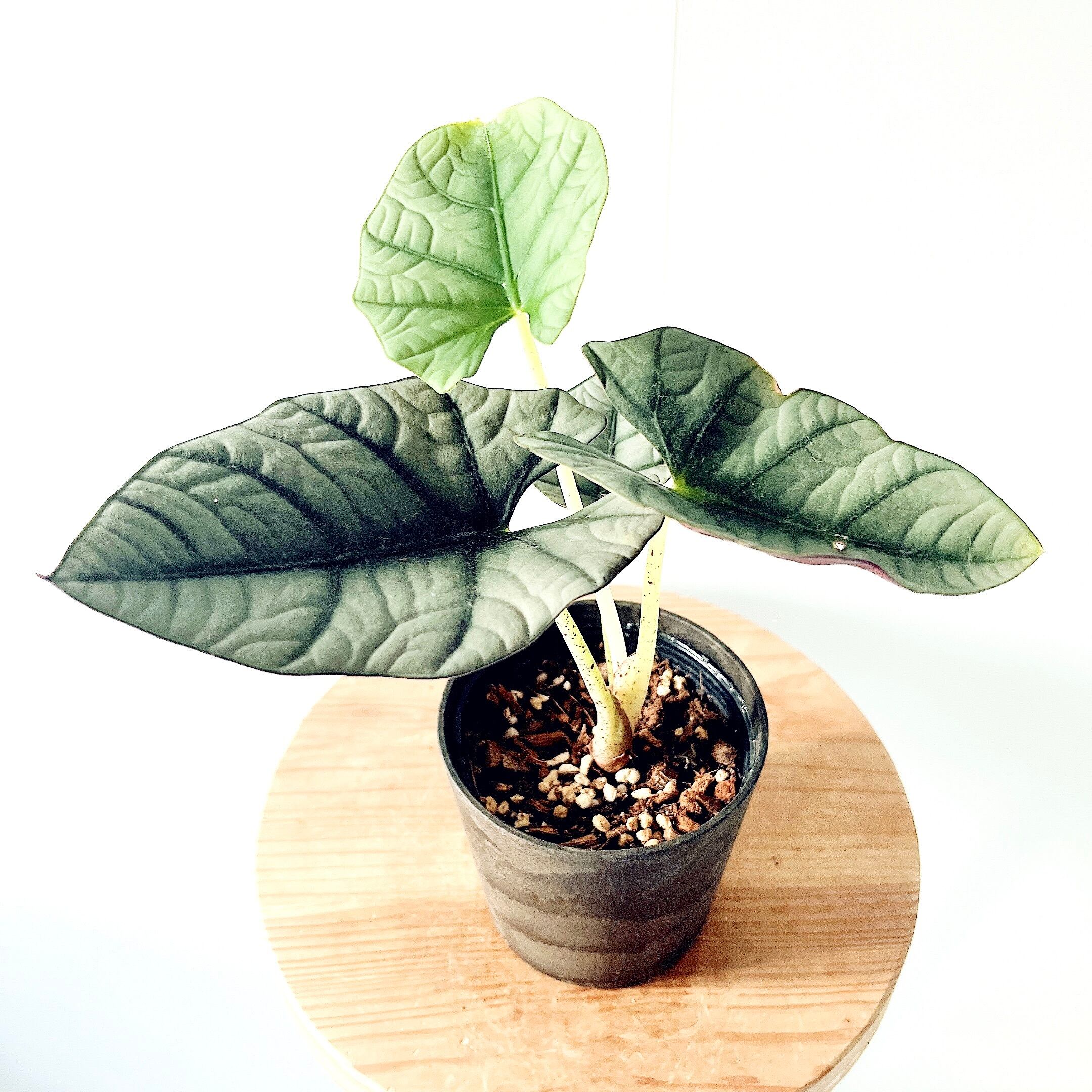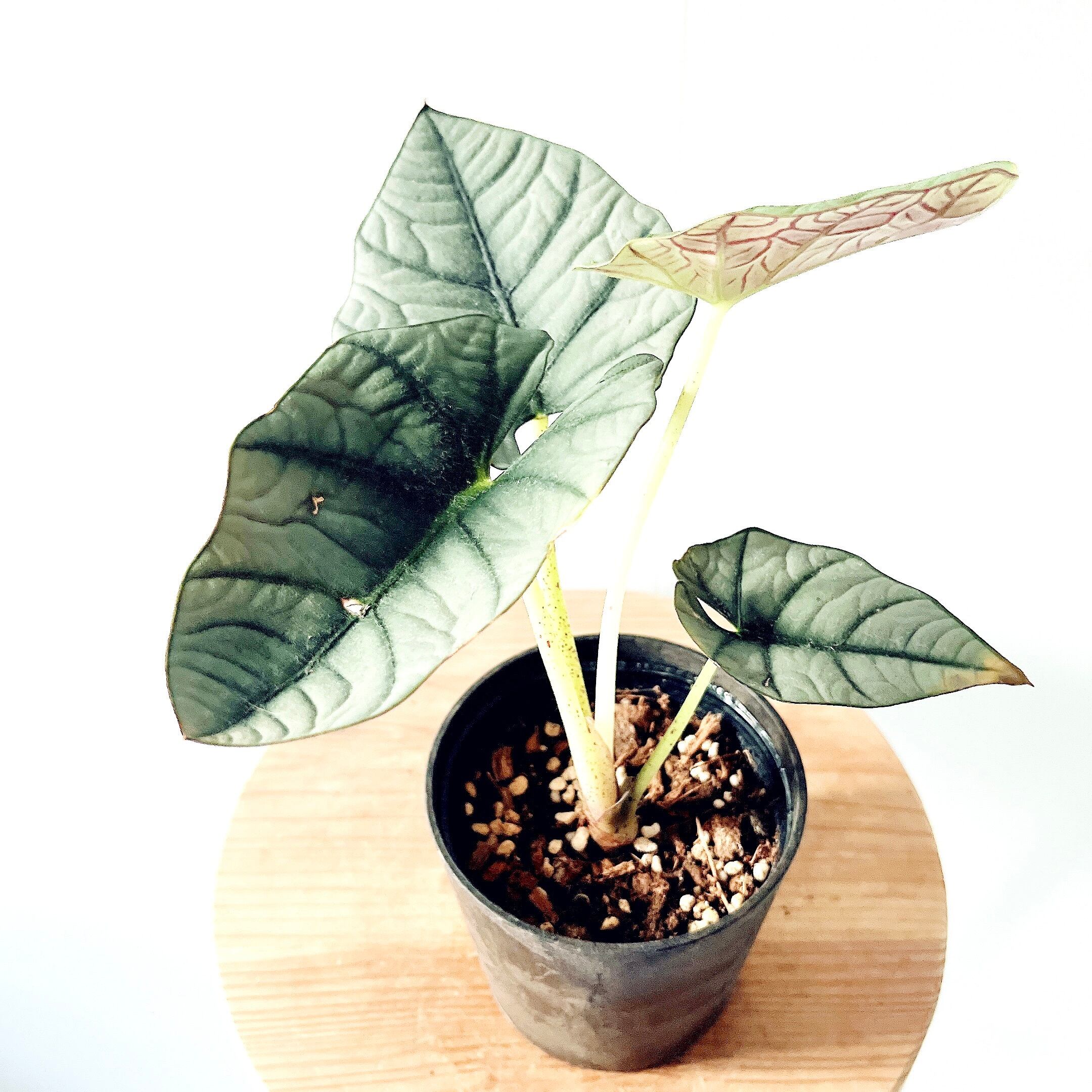 シルバーがかった葉色と、葉裏にほんのりと浮かぶ紫色が美しい希少なアロカシア・エレーン。