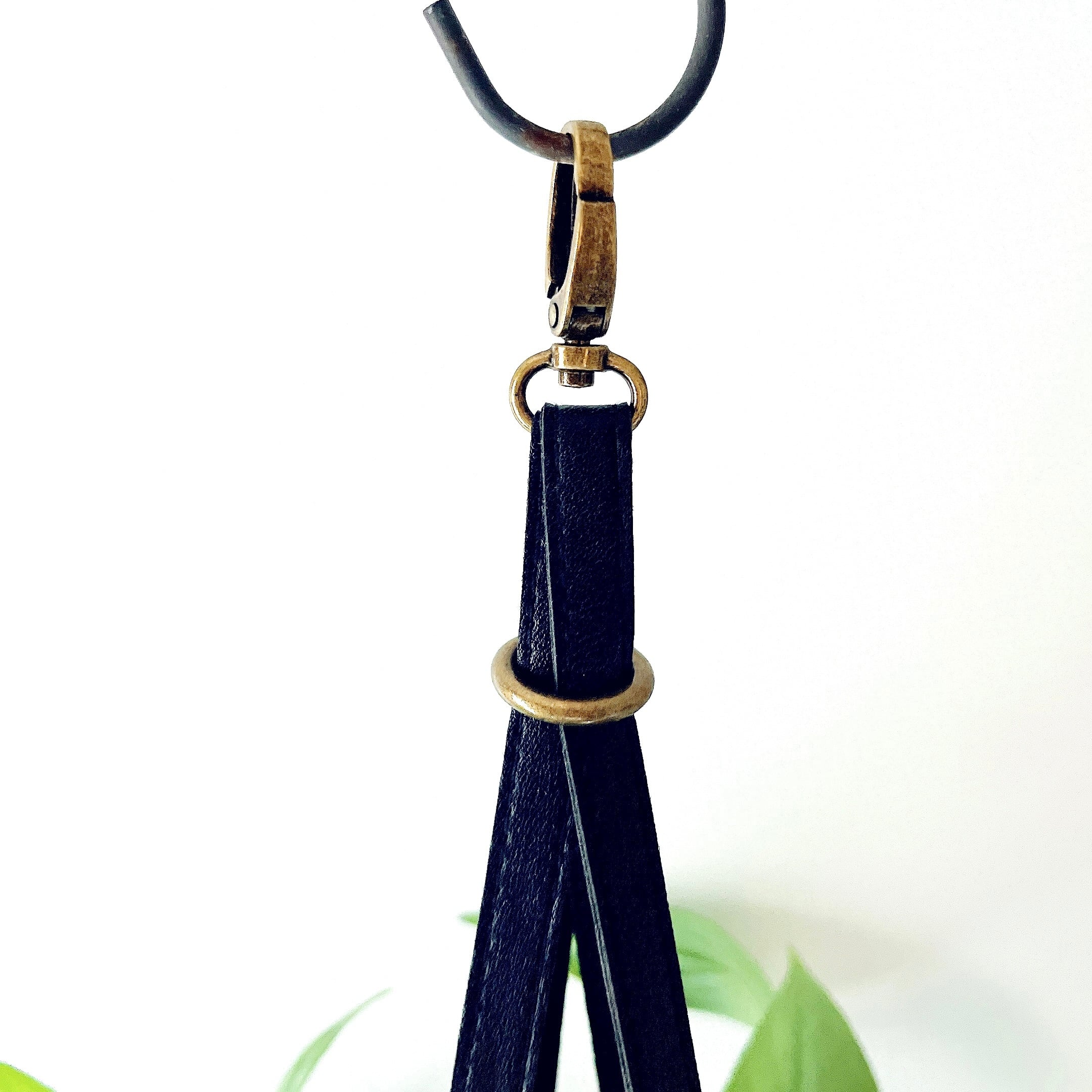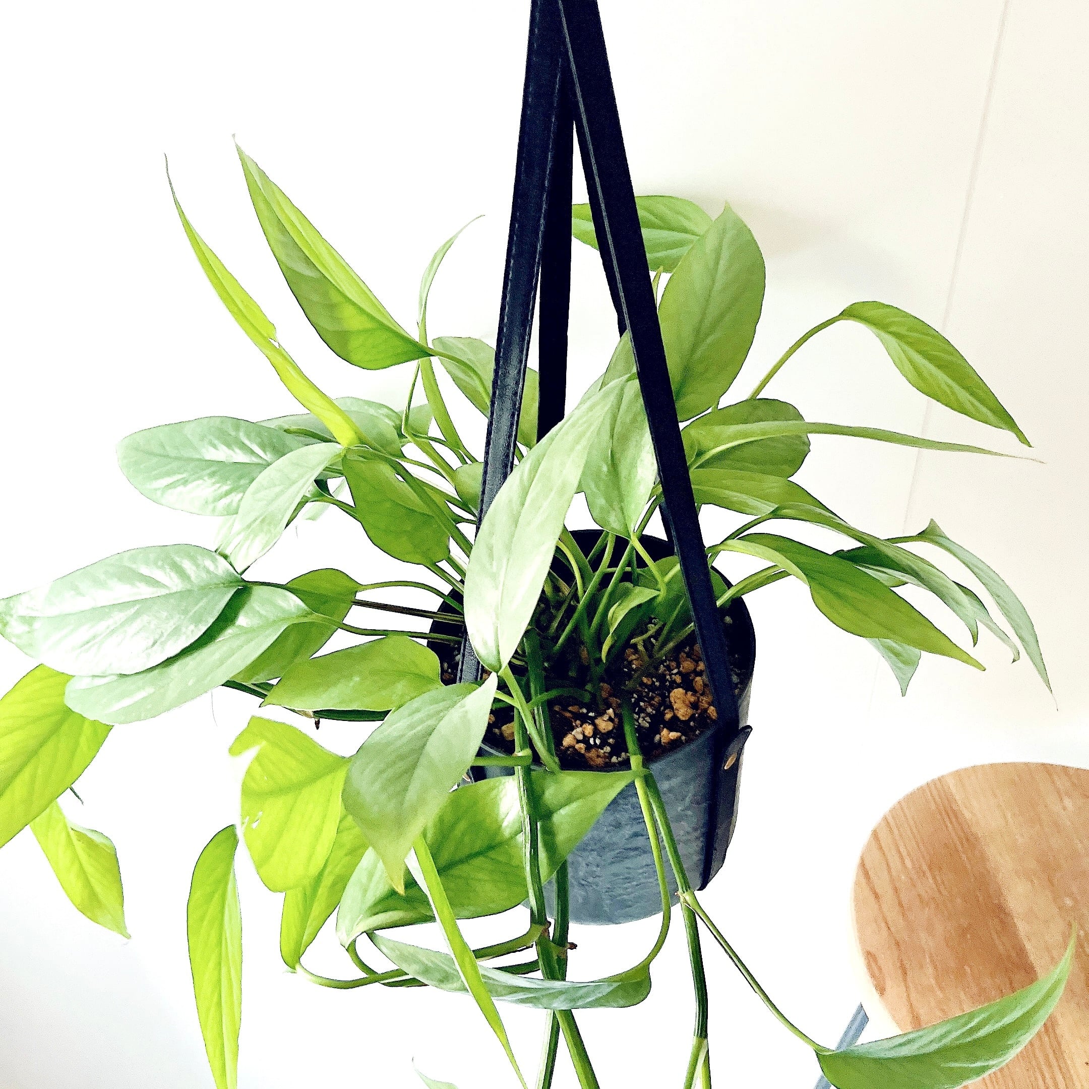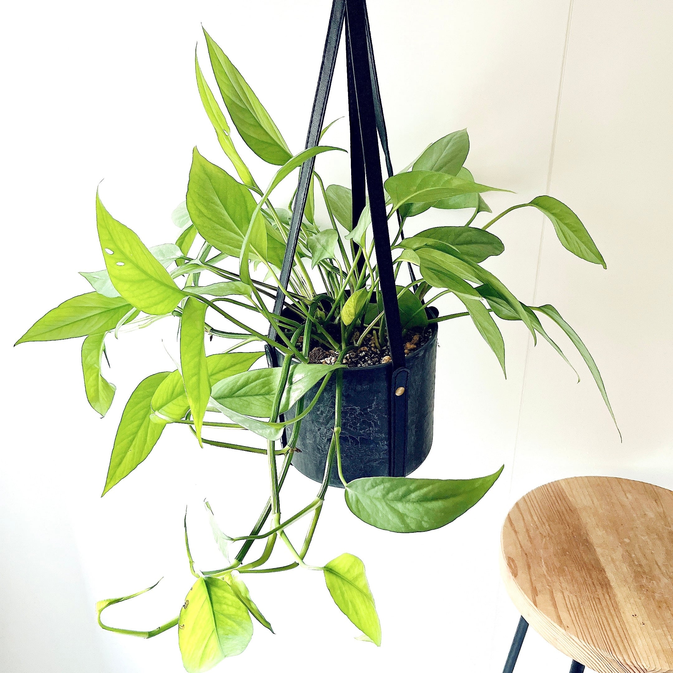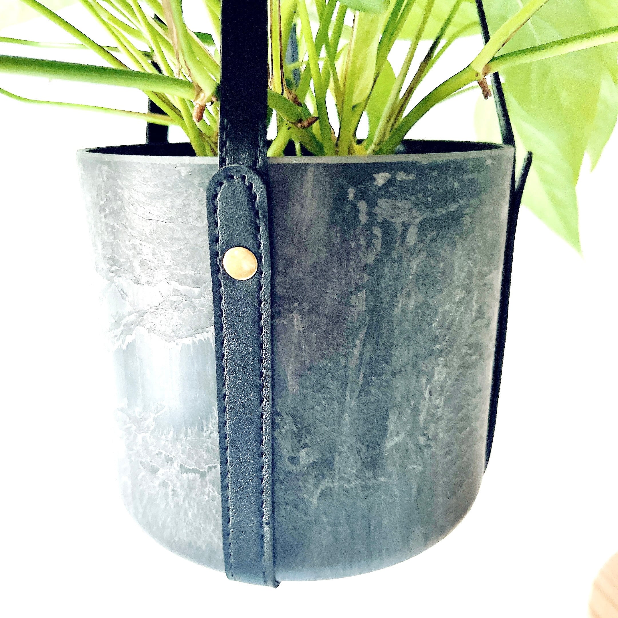 石のような重厚感のある質感なのに、驚くほど軽くて扱いやすいアートストーンポットに植え込み、レザー調のハンギングロープと合わせました。