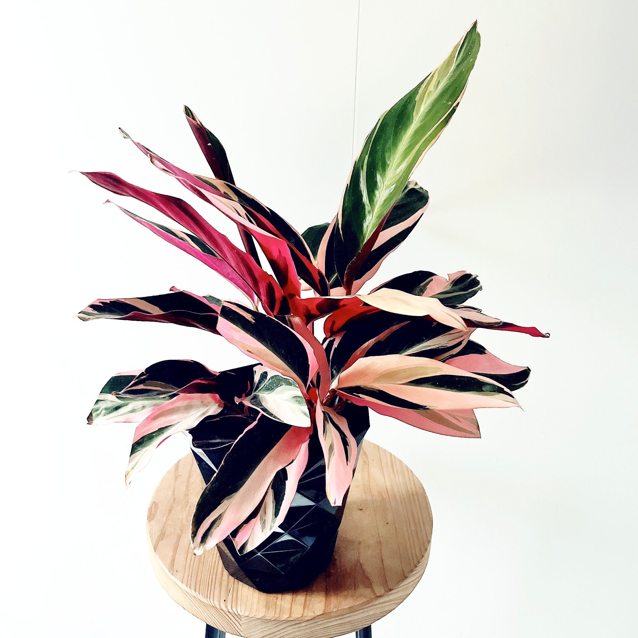 ストロマンテ マルチカラーは、トリオスターやトリカラーとも呼ばれる品種で、濃緑色の葉にクリーム色の斑が入り葉裏は美しい赤紫色をしています。